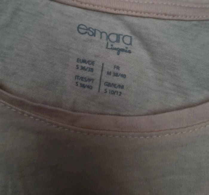 Petite robe de nuit rose clair ,taille 38-40 marque Esmara,100%coton,longueur 63cm, largeur 45cm, longueur épaule à aisselle 17cm, largeur aisselle à aisselle 46cm, largeur épaule à épaule 34cm.