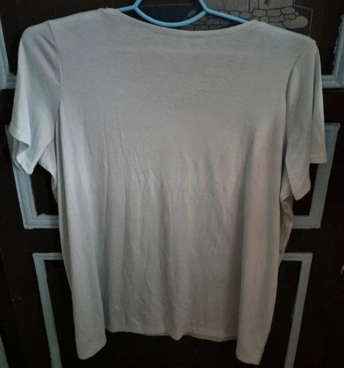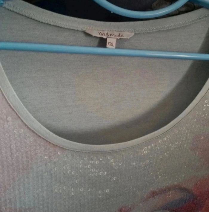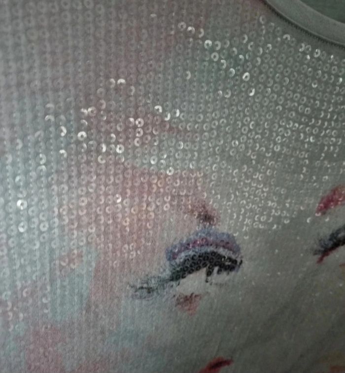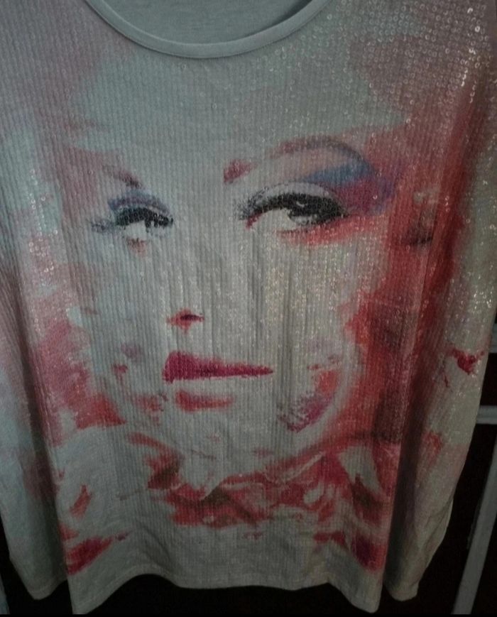 T-shirt avec sequins (visage femme),taille 2xl marque M&S Mode, longueur 75cm, largeur 64cm, longueur épaule à aisselle 20cm, largeur aisselle à aisselle 61cm.