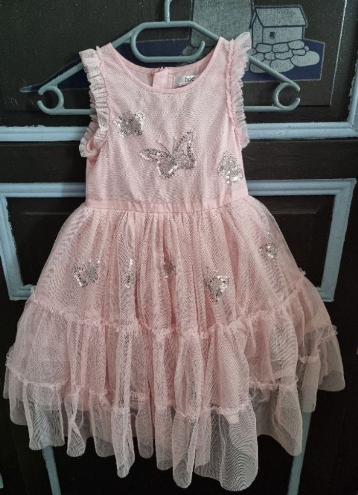 Robe fille pour toute occasions ou princesse, taille 116 (6ans) ,marque bpc bonprix collection, rose pale (photo 3 ont voit mieux la couleur), avec motifs papillons en sequins, jupon intégré, fermeture zippée dans le dos, effet gonflée comme les robes de princesse, 100%polyester,73cm de longueur,épaules à épaules 23cm,léger fils tiré voir photos.