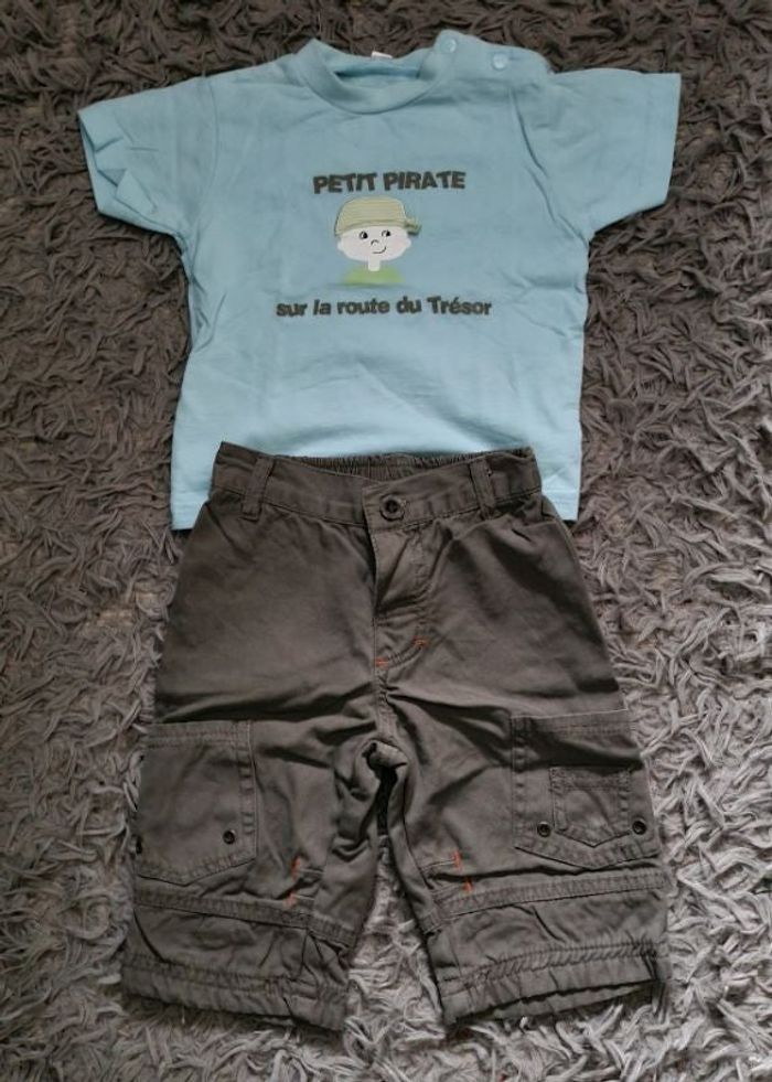 (Ensemble composé par mes soins 🤗) -T-shirt bleu clair avec pirate taille 6mois, -pantalon gris à poches taille 6mois.