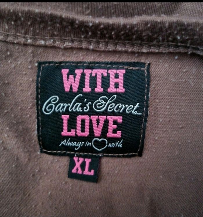 Robe de nuit marron à manches longues, taille XL marque Carla's Secret,longueur 81cm, largeur 53cm, longueur épaule à aisselle 23cm, largeur aisselle à aisselle 55cm,largeur épaule à épaule 47cm, longueur manche 53cm à des peluches sinon très bonne état.