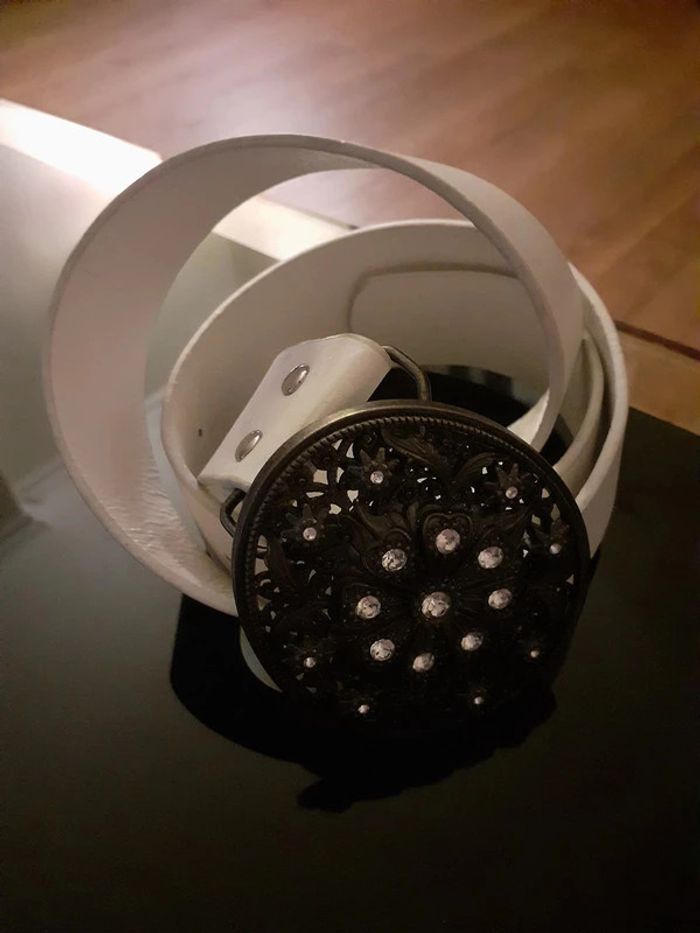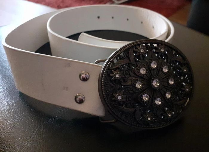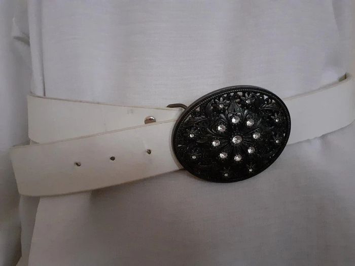 Jolie ceinture Coloris : Blanc Longueur : 95 cms Largeur : 4 cms 100% PVC Boucle argentée, avec strass Etat impeccable #carlisle66ceinture