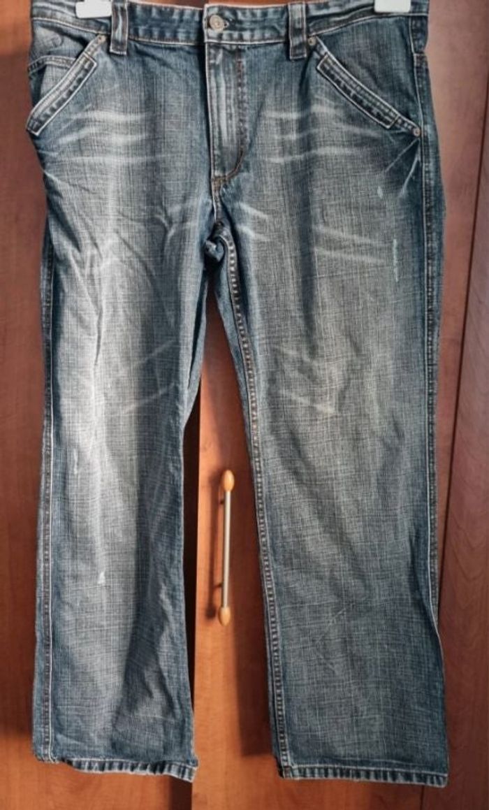 Jeans homme effet délavé et effet usé à diverses endroits, taille 48 marque C&A,longueur 105cm, largeur de la taille 49cm, largeur cuisse 31cm, largeur cheville 24cm,légèrement usé aux chevilles voir dernière photo.
