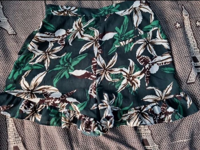 Short imprimé tropical, taille XS marque Mango,2 poches sur les côtés et une à l'arrière, léger et transparent,zip sur un coté, longueur 36cm, largeur de la taille 34cm, largeur cuisse 26cm.