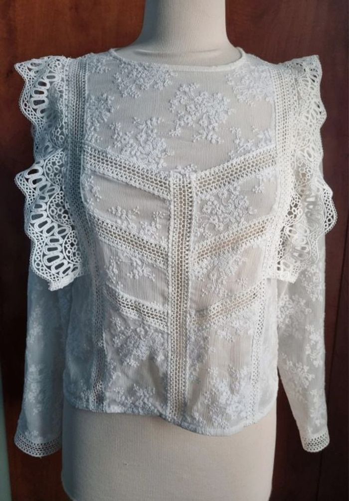 Blouse à manches longues et motifs effet dentelle, taille 34 marque Pimkie, longueur 53cm, largeur 41cm,longueur épaule à aisselle 20cm, largeur aisselle à aisselle 41cm, longueur manche 55cm,transparente, légèrement jaunis sous les aisselles et au col voir les dernières photos.