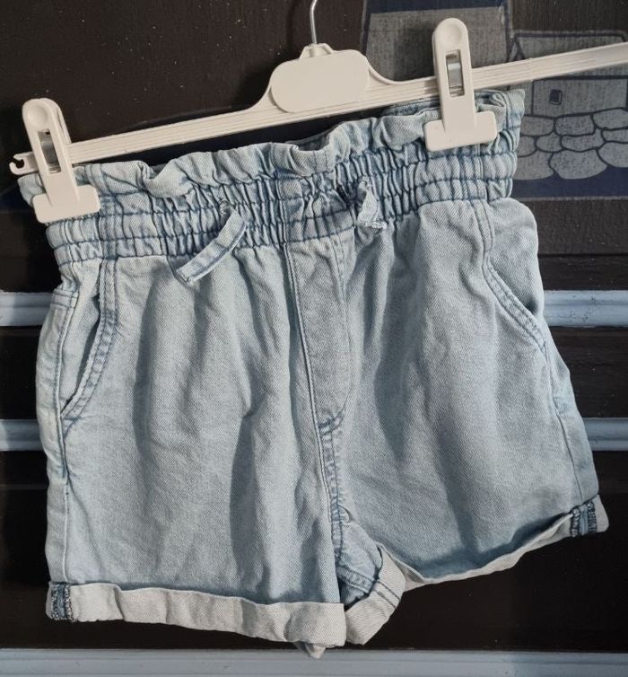 Short en jeans élastique à la taille, marque Kiabi taille 32,longueur 33cm, largeur de la taille 30cm jusqu'à 33cm,largeur cuisse 23cm.