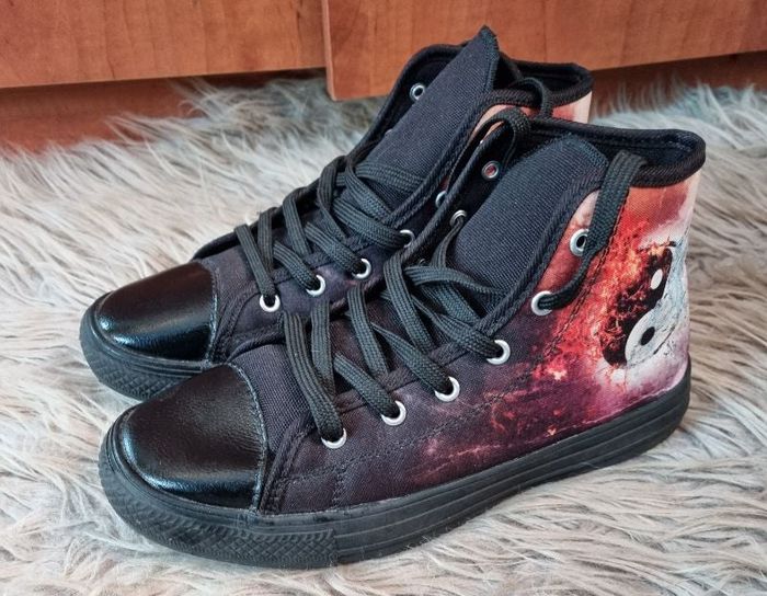 Basket montante motifs yin yang (eau et feu),en toile, pointure 37,très peut porté 3-4fois.