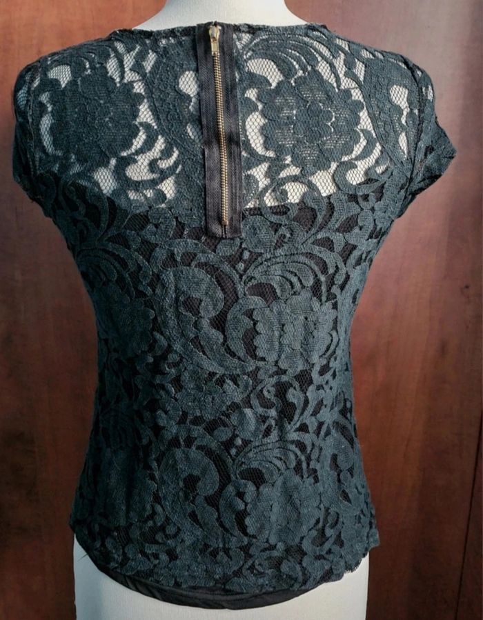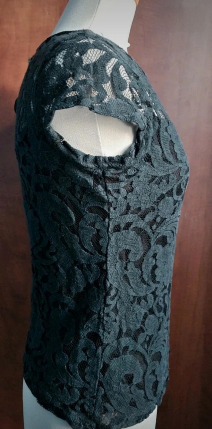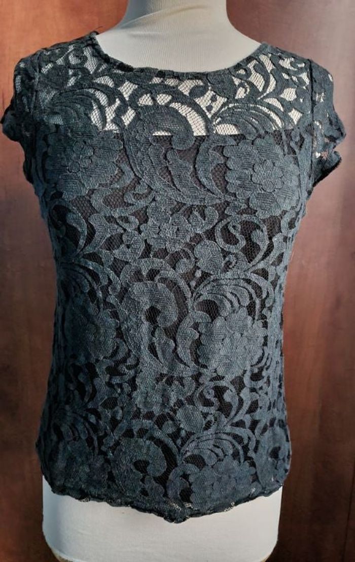 T-shirt noir effet brodé avec bustier intégré taille S, longueur 54cm, largeur 42cm, longueur épaule à aisselle 15cm, largeur aisselle à aisselle 40cm.