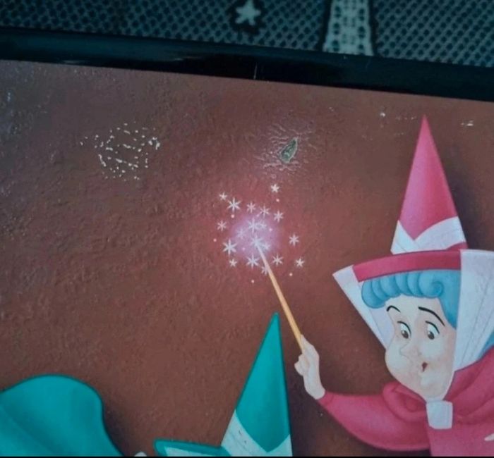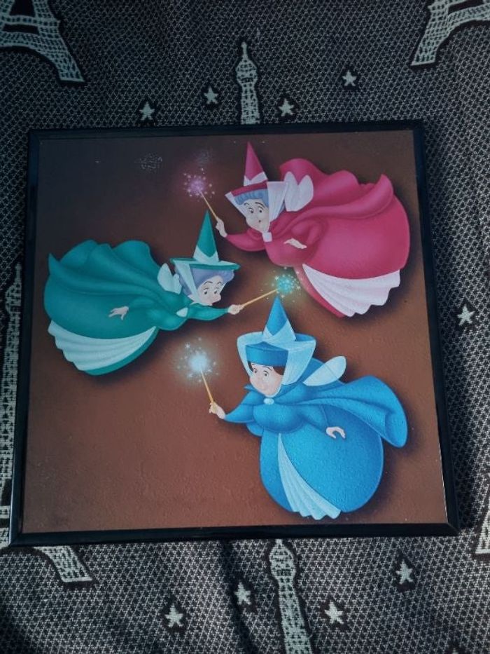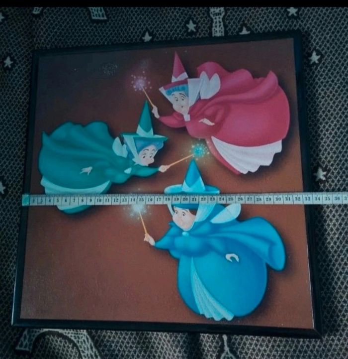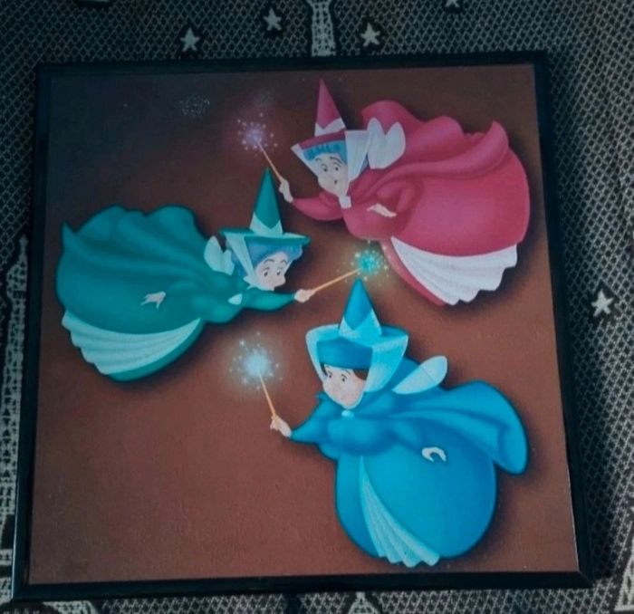 Tableau Disney Les 3 Bonnes Fées (Dame Flora, Dame Pâquerette et Dame Pimprenelle),matière carton dur et contour plastique,manque légèrement de la peinture voir photo, (avais été acheté à un particulier qui avait rafistoler à certains endroits) se voir pas car derrière.