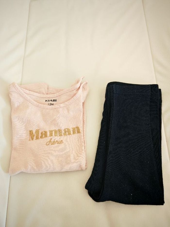 Taille 12 mois, très bon état Legging bleu marine et tee shirt rose clair Légers