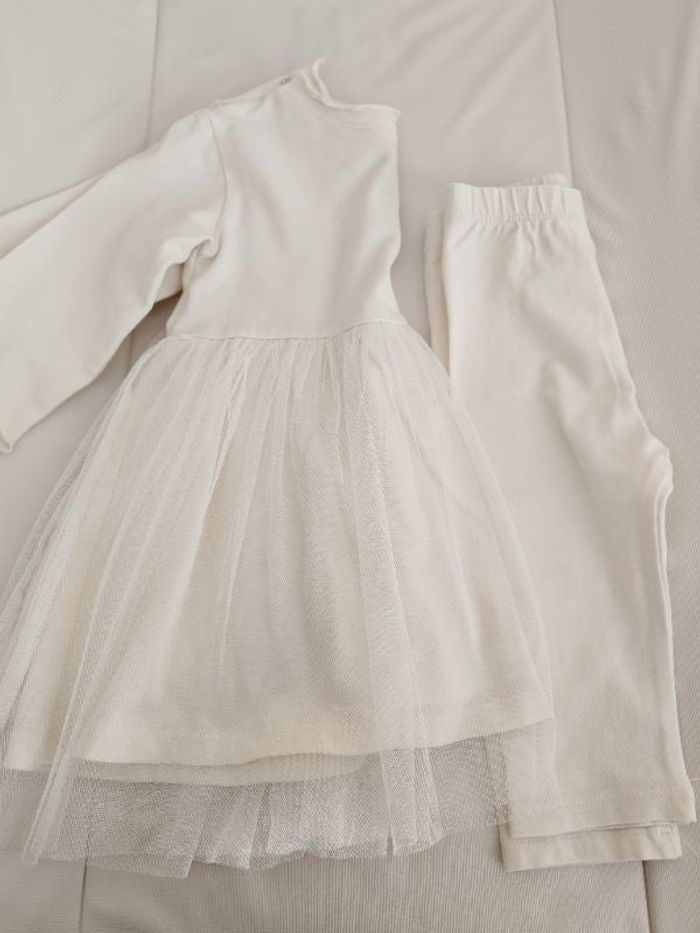 Taille 9 mois, excellent état, coloris écru Robe manches longues avec jupon en tulle blanche au dessus, legging assorti