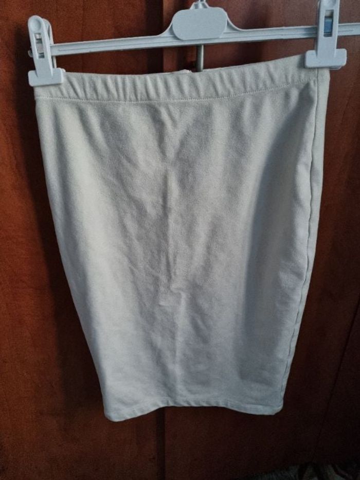 Jupe effet velours au touché,couleur crème, taille 34 marque Kiabi, zip à l'arrière, longueur 54cm, largeur de la taille 35cm, largeur 39cm.