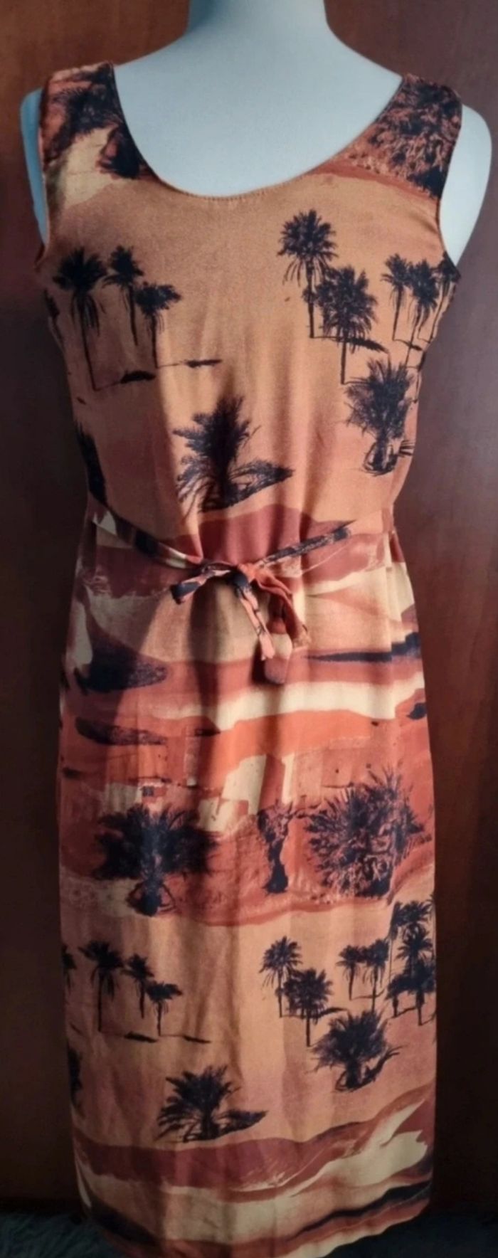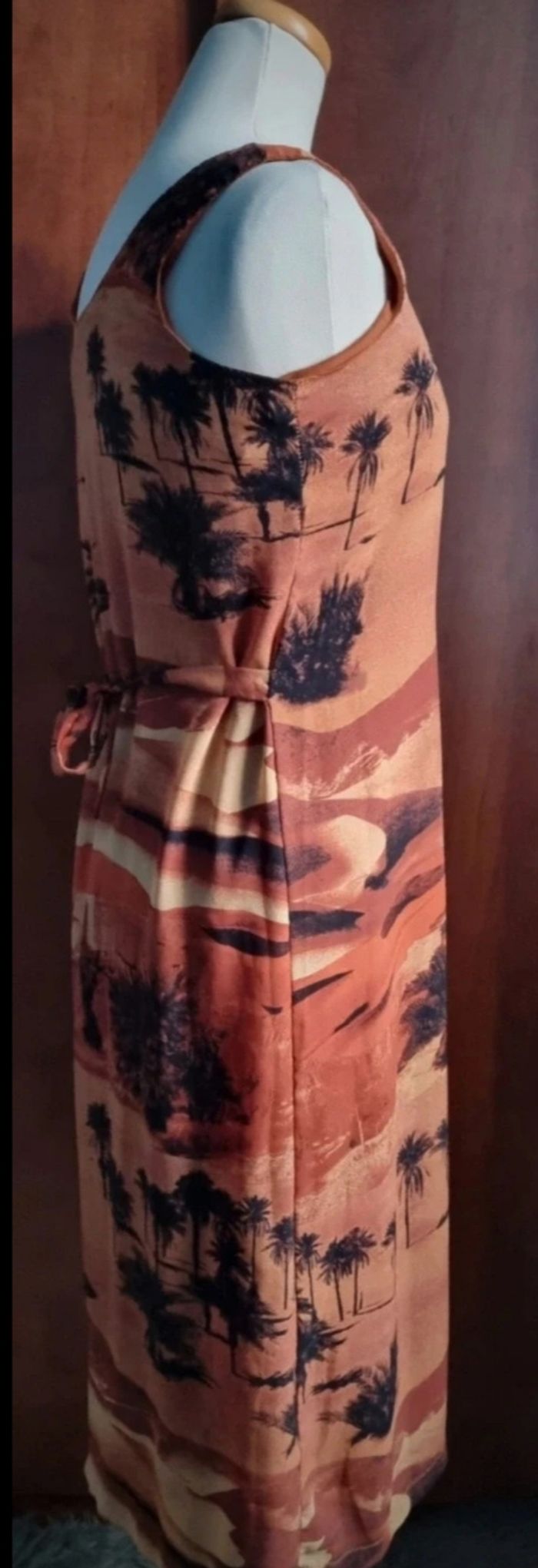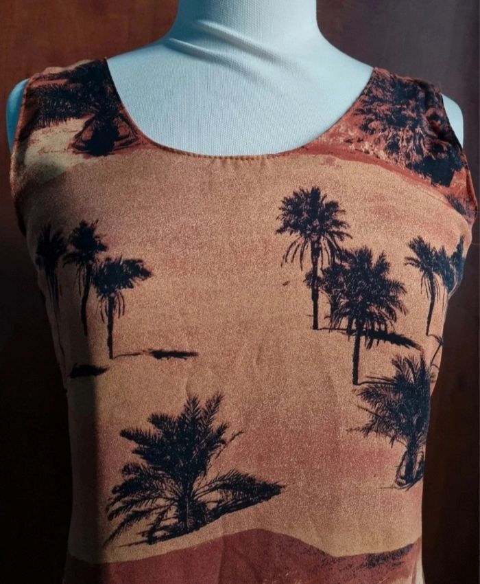 Robe longue sans manches imprimé paysage taille 1,longueur 114cm, largeur 58cm, longueur épaule à aisselle 19cm, largeur aisselle à aisselle 47cm.