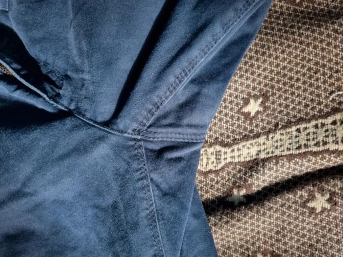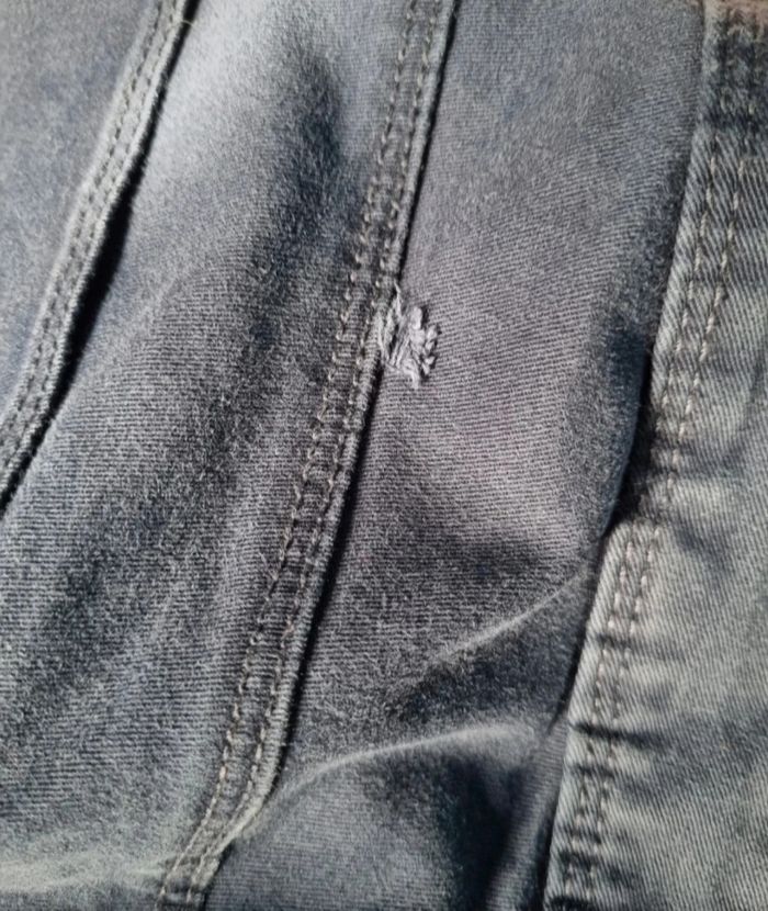 Jean bleu marine taille 40,longueur 95cm, largeur de la taille 40cm, largeur cuisse 26cm, largeur cheville 16cm, (des ourlets on été fait),trou voir dernière photo.