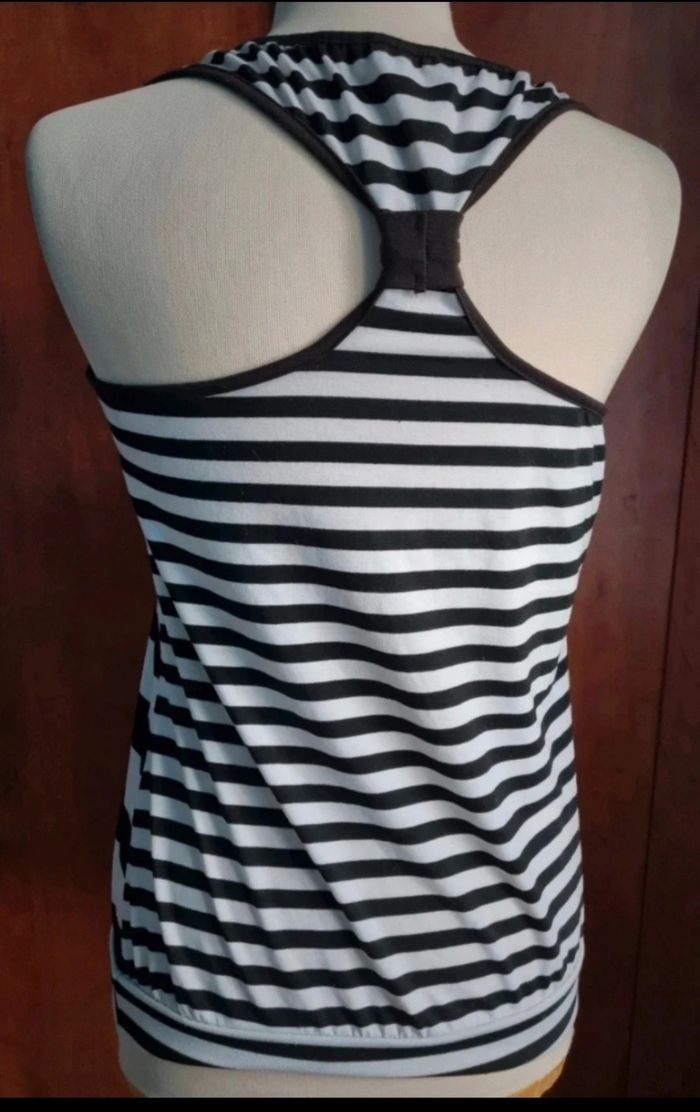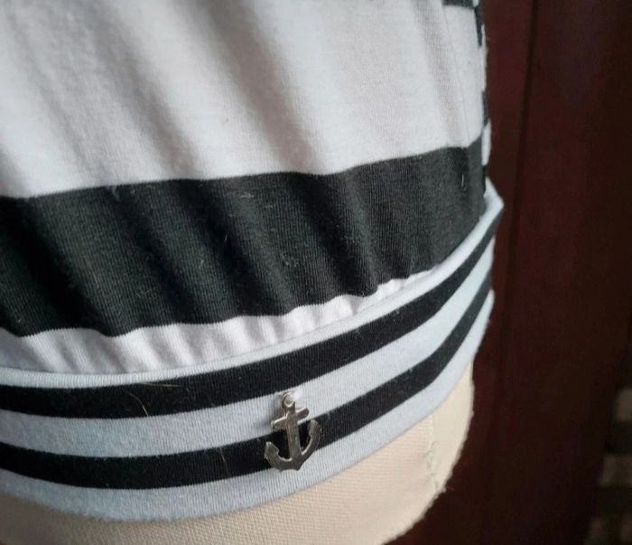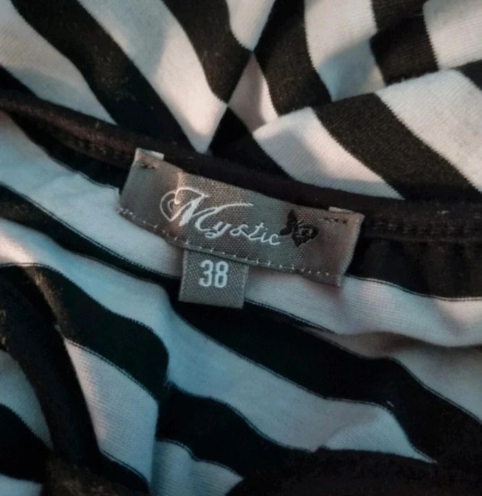 Débardeur à rayures style marin, taille 38 marque Mystic, nouée au dos,petite ancre marine à strass en bas du débardeur, longueur 62cm, largeur 42cm, longueur épaule à aisselle 19cm, largeur aisselle à aisselle 41cm.