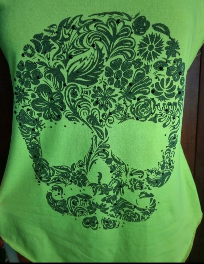 Débardeur vert fluo avec tête de morts et strass taille L,longueur 61cm, largeur 49cm, longueur épaule à aisselle 27cm, largeur aisselle à aisselle 49cm.