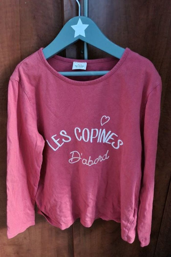 Pull rose avec écriture (les copines d'abord)blanc et pailleté,taille 10ans marque Tape à l'œil.