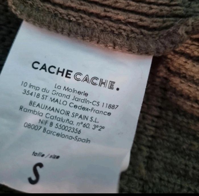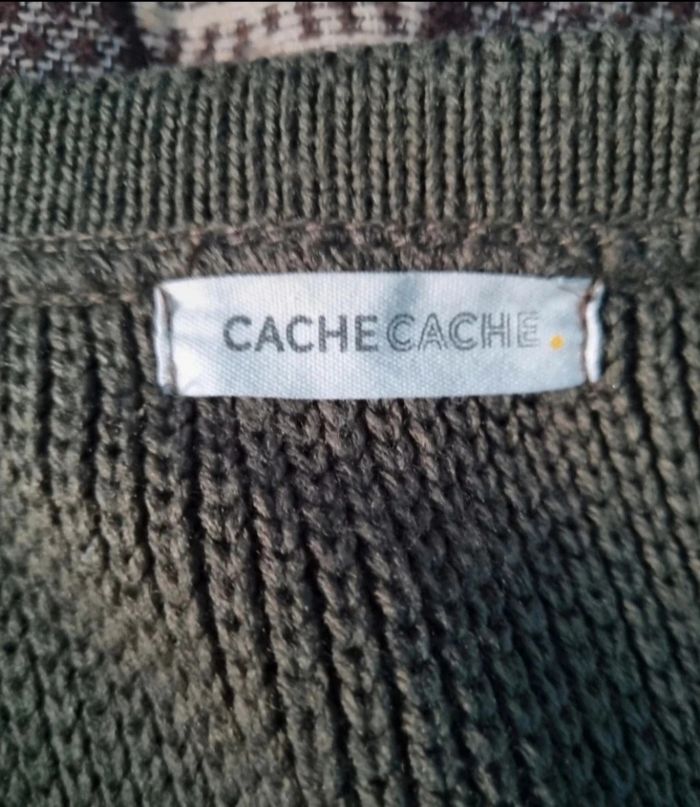 Cardigan kaki,taille S marque Cache-cache, longueur 50cm, largeur 47cm, longueur épaule à aisselle 18cm, largeur aisselle à aisselle 50cm, longueur manche 54cm, largeur épaule à épaule 43cm.