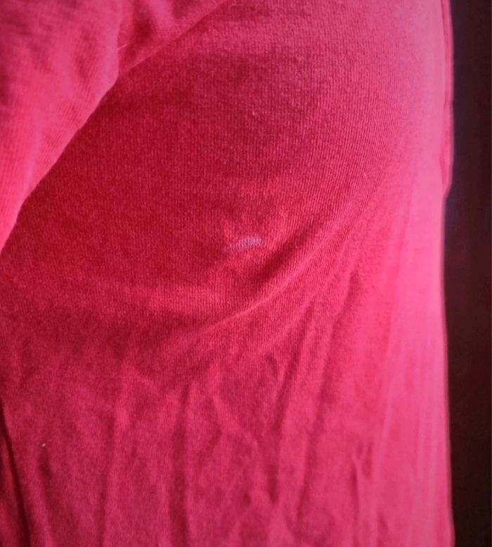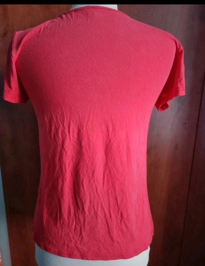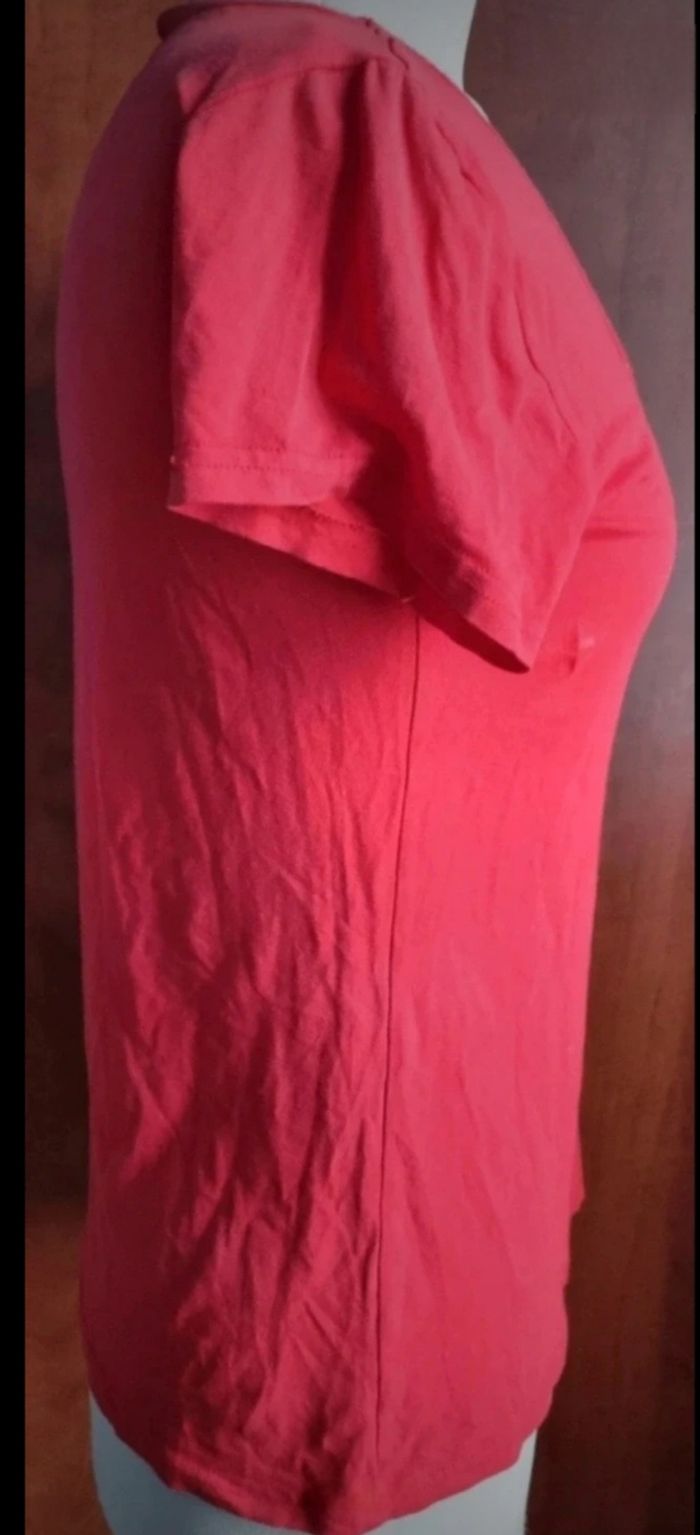 T-shirt rouge taille 2,longueur 59cm, largeur 43cm, longueur épaule à aisselle 16cm, largeur aisselle à aisselle 44cm, petit trou et légère tache voir les 2 derrière photos.