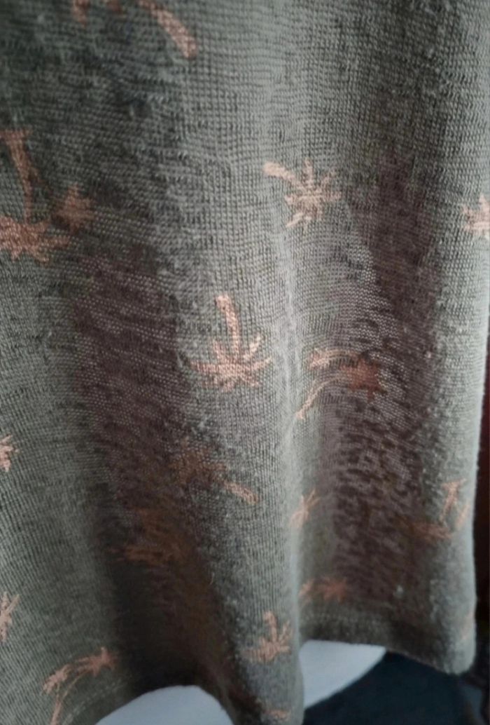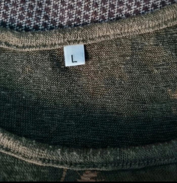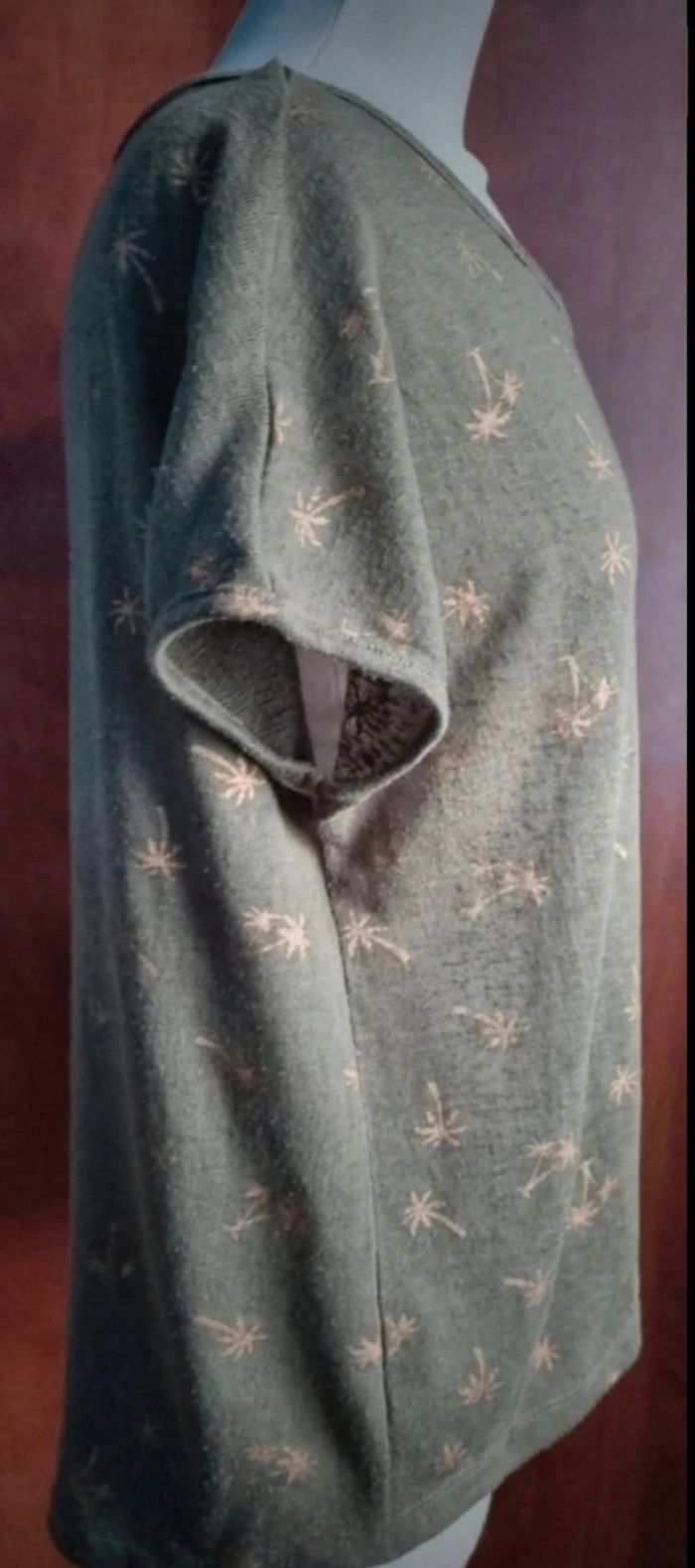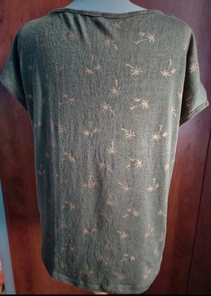 T-shirt kaki à motifs palmiers taille L,longueur avant 59cm ,longueur arrière 64cm, largeur 53cm, longueur épaule à aisselle 16cm, largeur aisselle à aisselle 58cm,effet transparent.