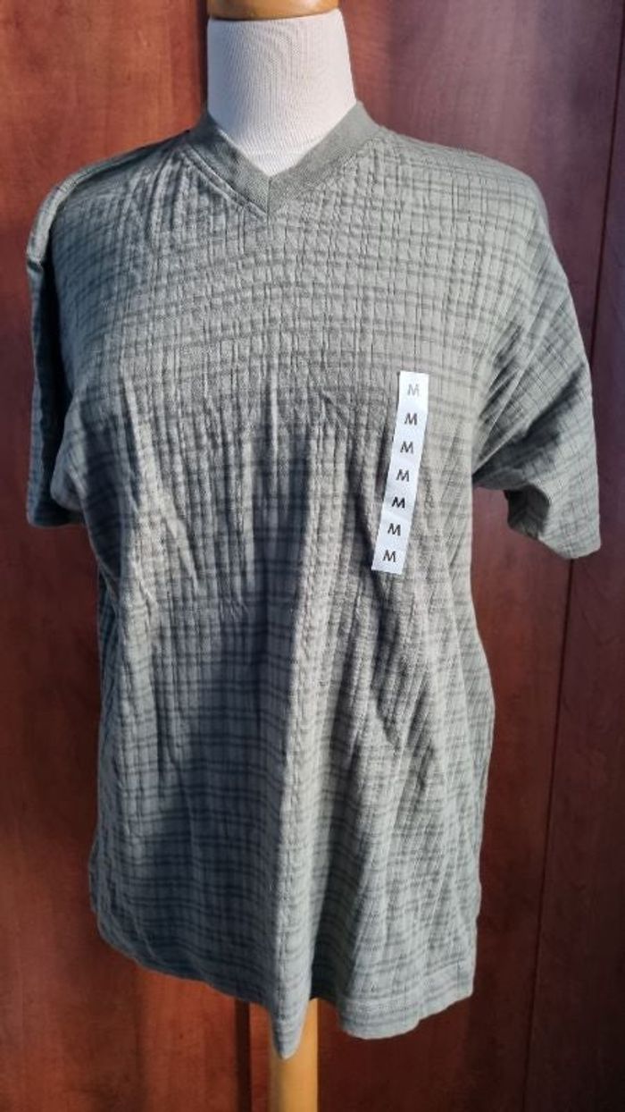 T-shirt à rayures kaki ,taille M marque CS Active, longueur 70cm, largeur 53cm, longueur épaule à aisselle 27cm, largeur aisselle à aisselle 55cm.