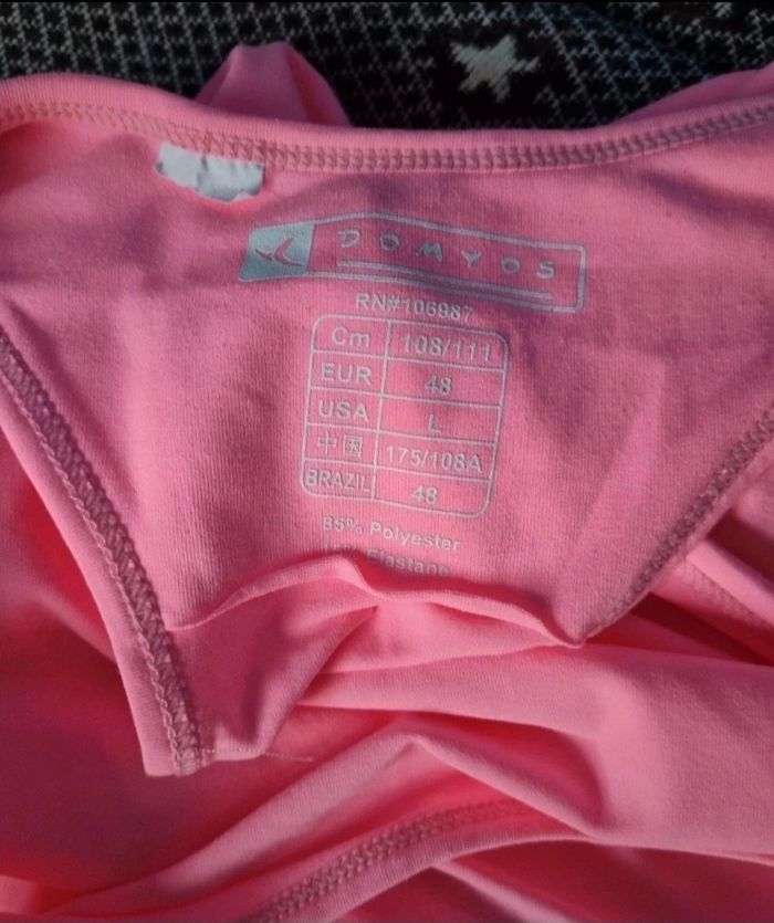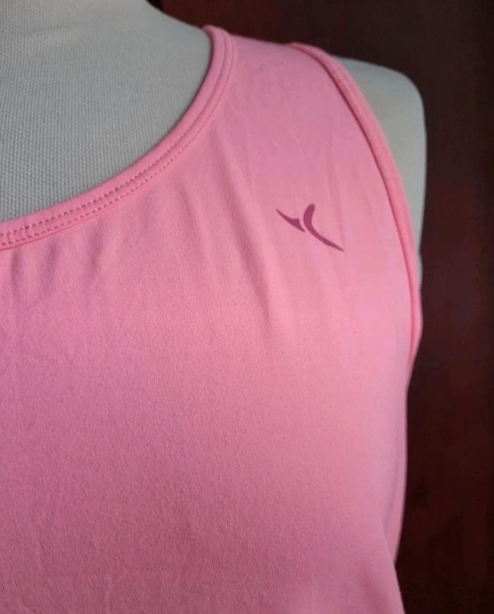 Débardeur rose fluo, taille L marque Domyos ,longueur 67cm, largeur 45cm, longueur épaule à aisselle 25cm, largeur aisselle à aisselle 45cm.
