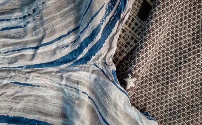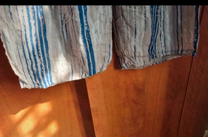 Pantalon léger à rayures taille 44-46, longueur 97cm, largeur de la taille 35cm jusqu'à 44cm, largeur cuisse 34cm,largeur cheville 26cm, agréable à portée.