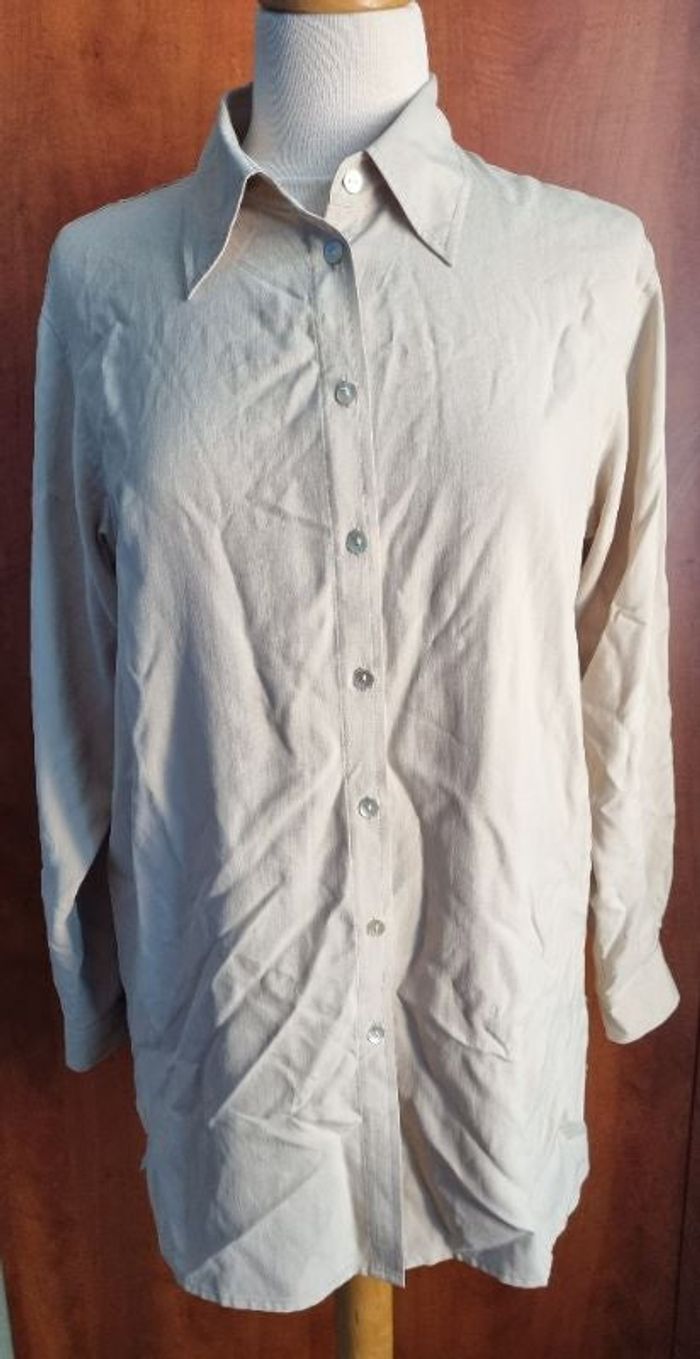 Chemise à manches longues ,taille 38 marque Damart, 100%soie ,boutons en nacrée, couleur crème, longueur 74cm, largeur 50cm, longueur épaule à aisselle 24cm, largeur aisselle à aisselle 49cm, longueur manche 53cm.