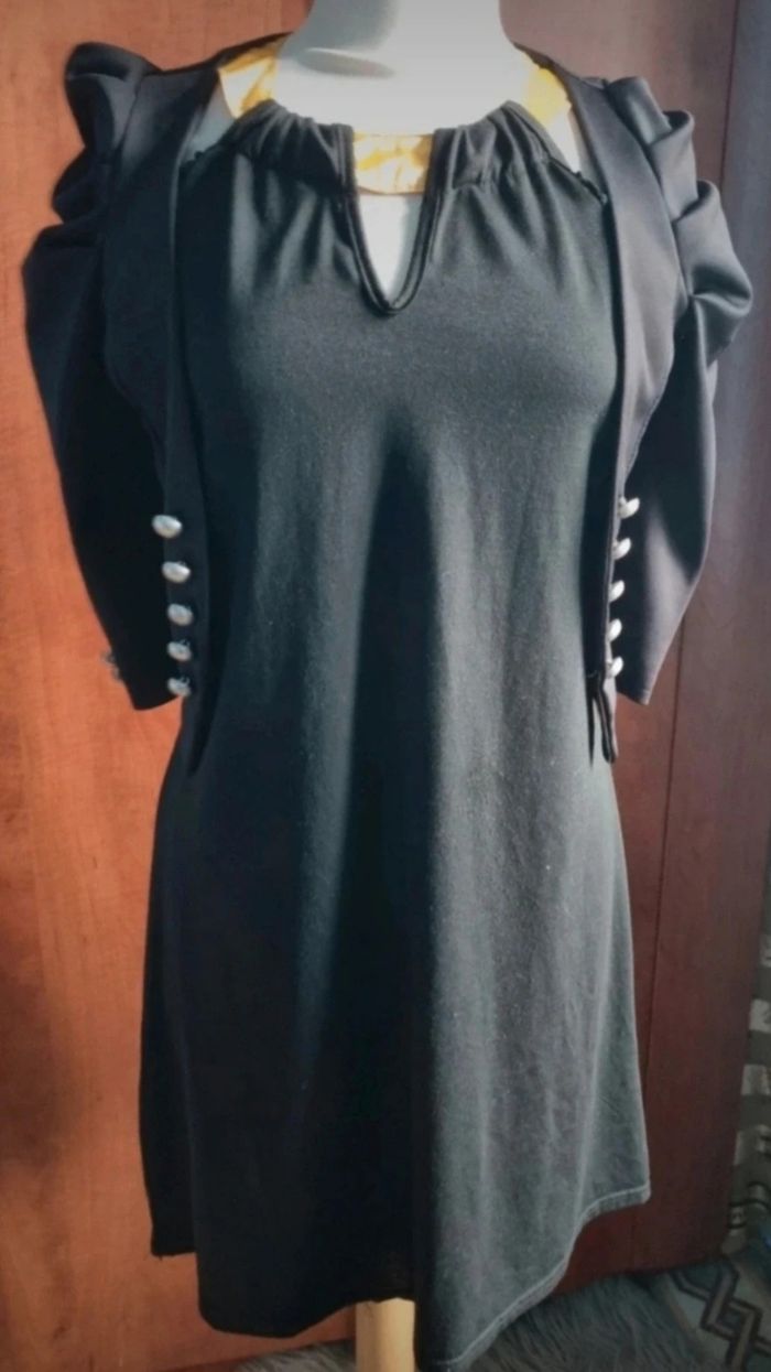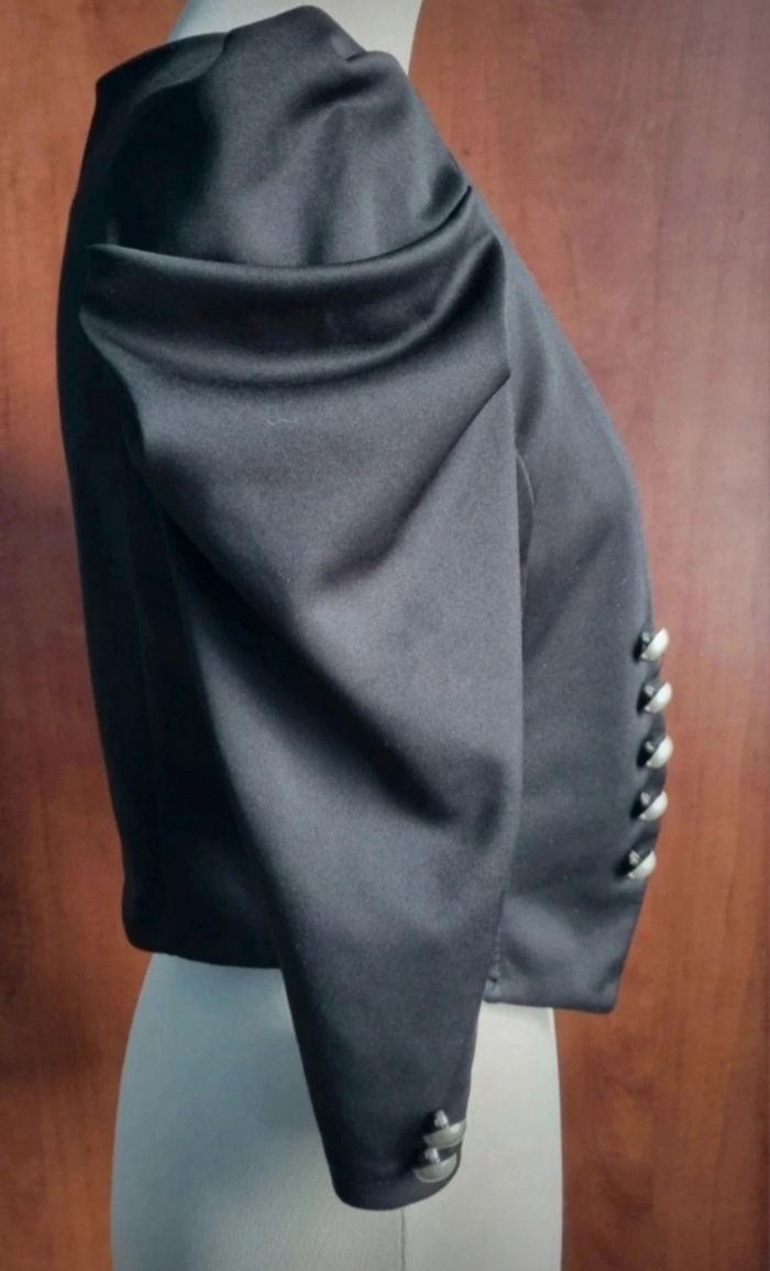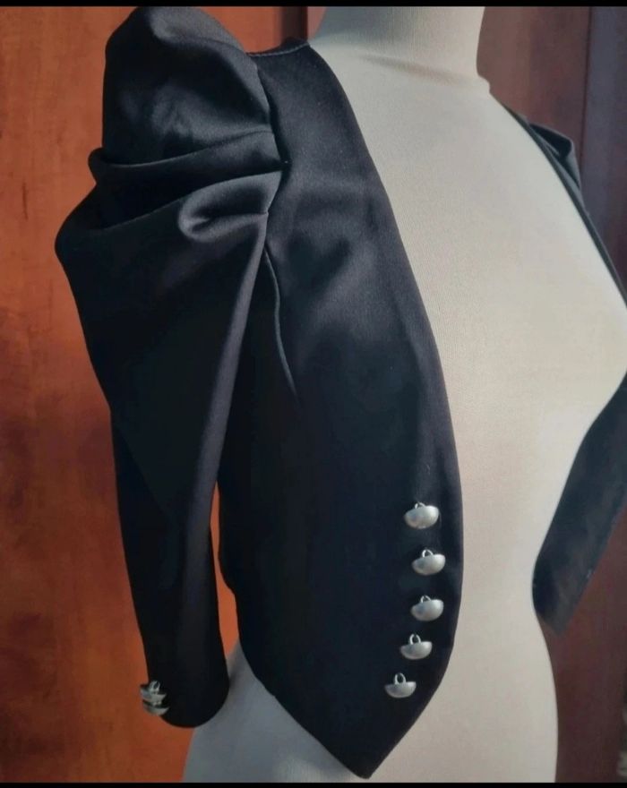 Boléro noir taille M,longueur 40cm, largeur 33cm, longueur manche 43cm, largeur aisselle à aisselle 38cm, longueur épaule à aisselle 17cm.