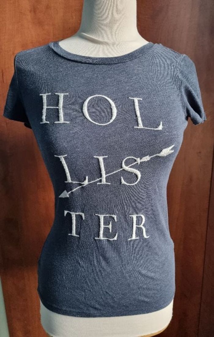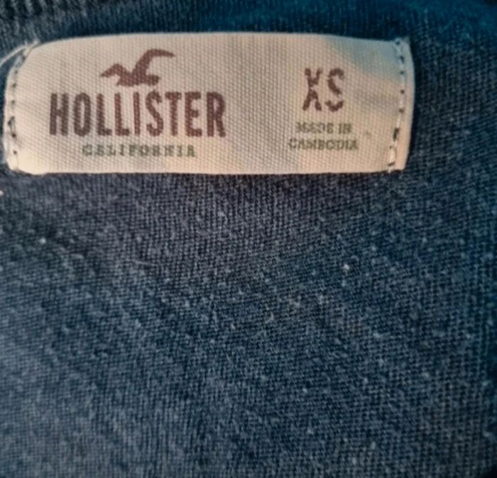 T-shirt avec écriture, taille XS marque Hollister ,longueur 60cm, largeur 36cm, longueur épaule à aisselle 17cm, largeur aisselle à aisselle 37cm.