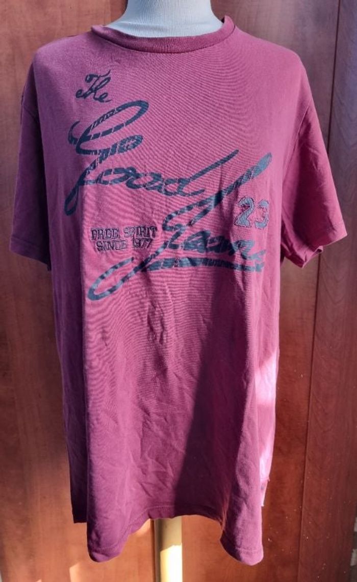 T-shirts bordeaux avec écriture, taille XL marque Goldsmith,longueur 75cm, largeur 59cm, longueur épaule à aisselle 23cm, largeur aisselle à aisselle 61cm, légère tache voir dernière photo.