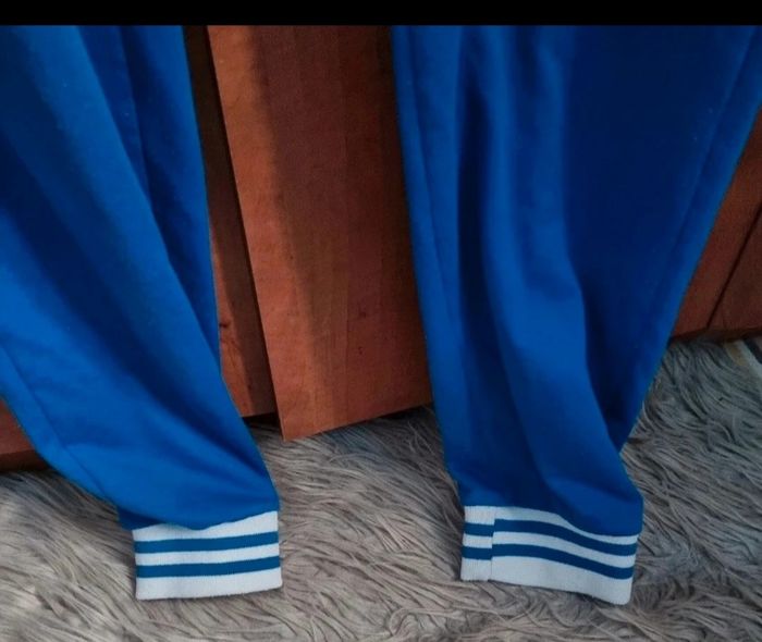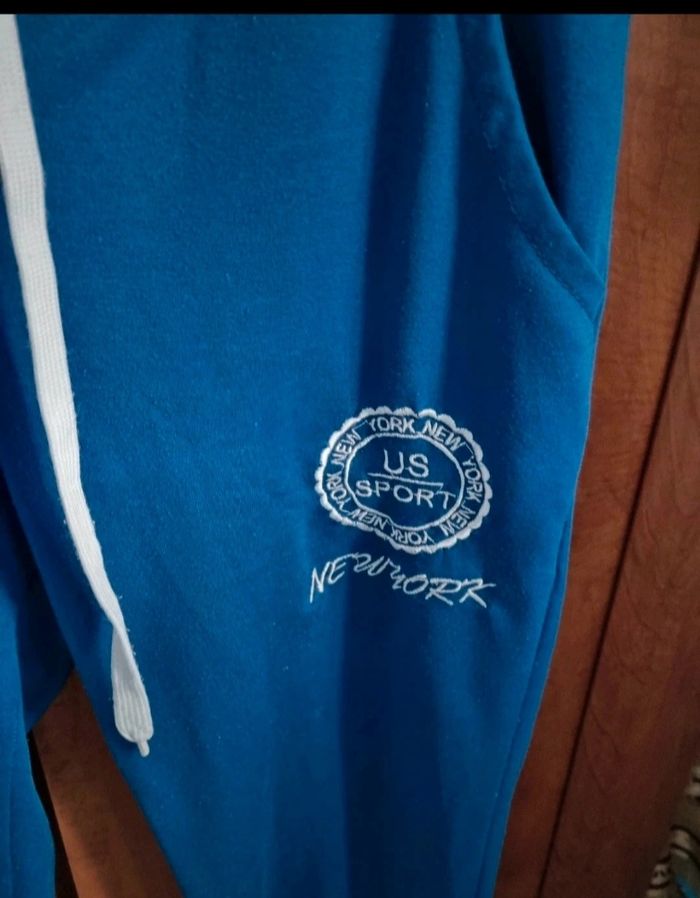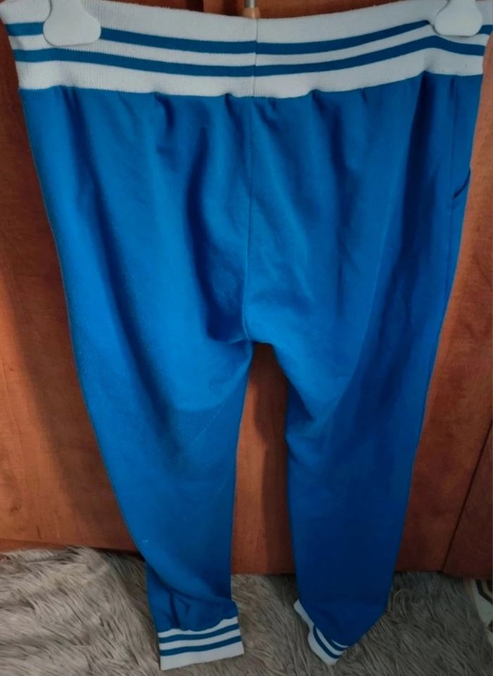 Pantalon de sport bleu taille 40-42, longueur 96cm, largeur de la taille 43cm, largeur cuisse 28cm, largeur cheville 19cm,légère taches voir dernière photo.