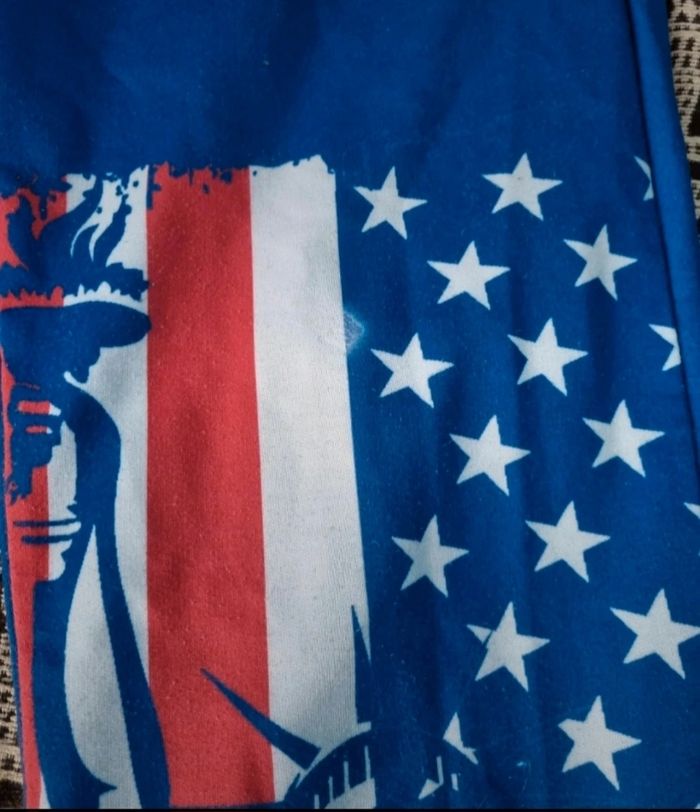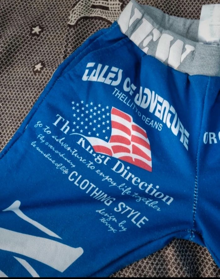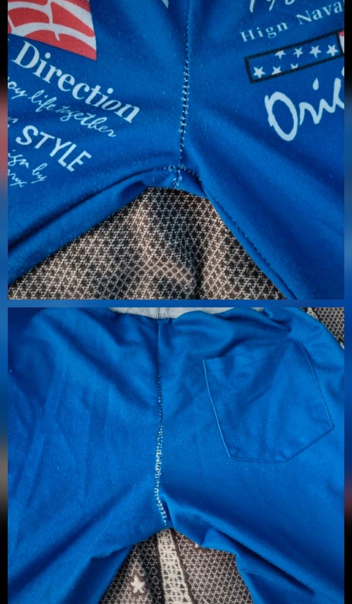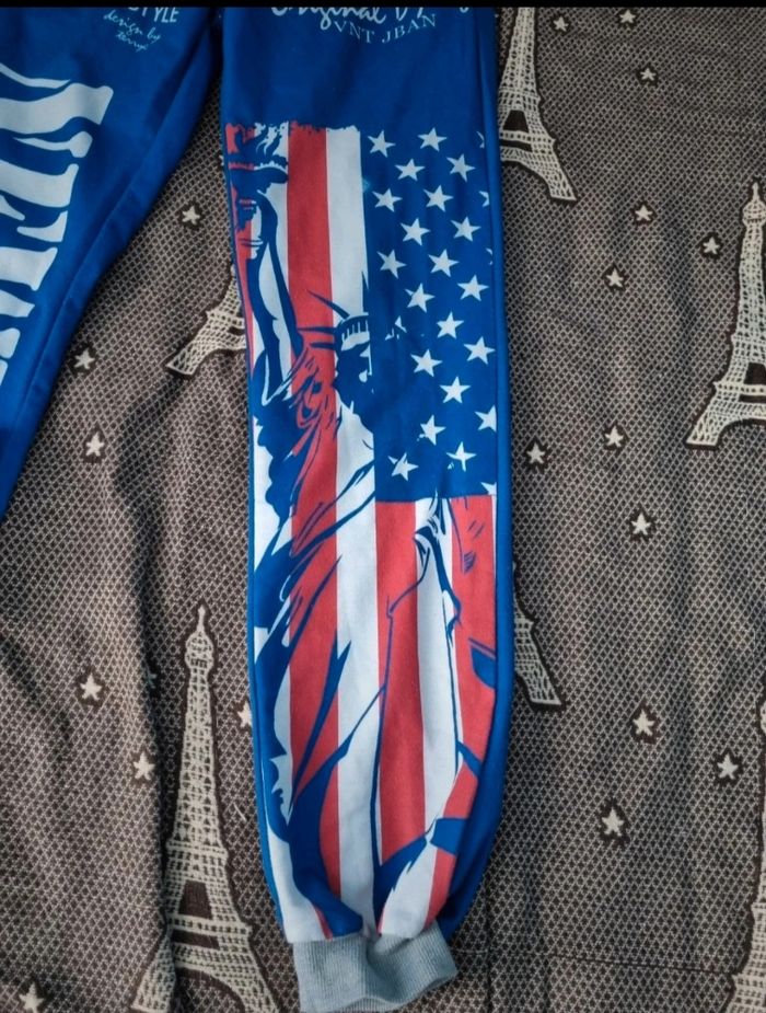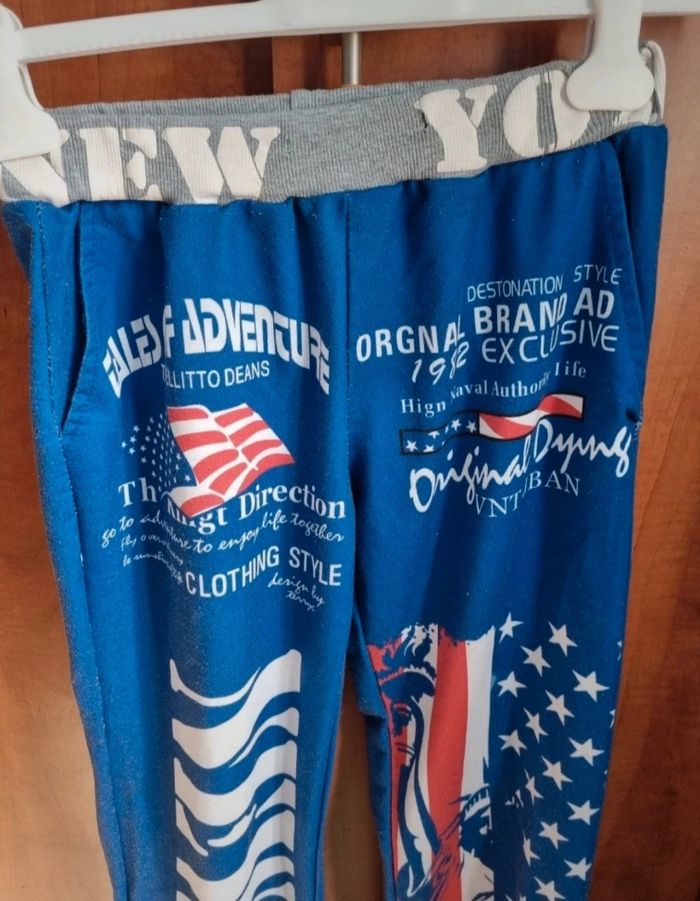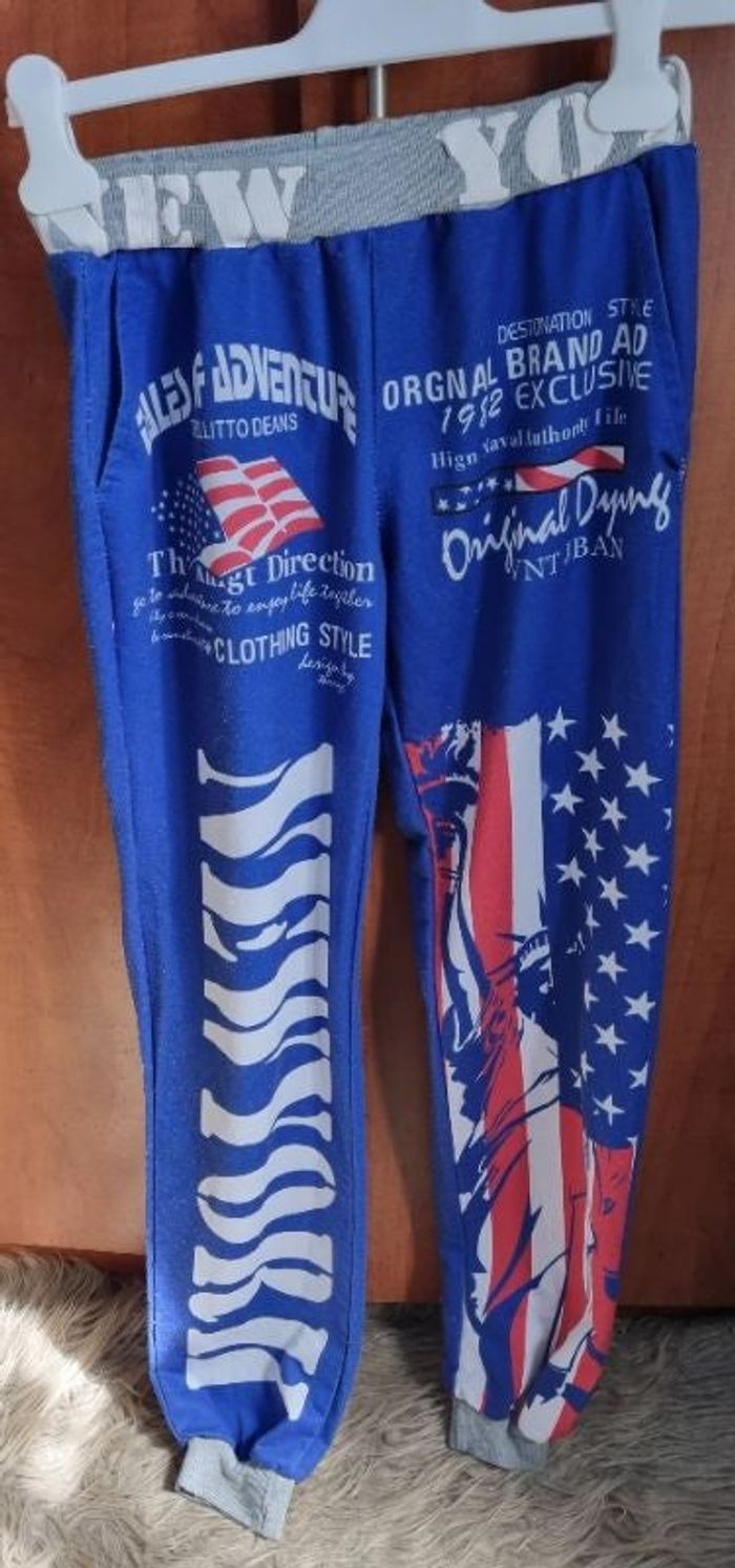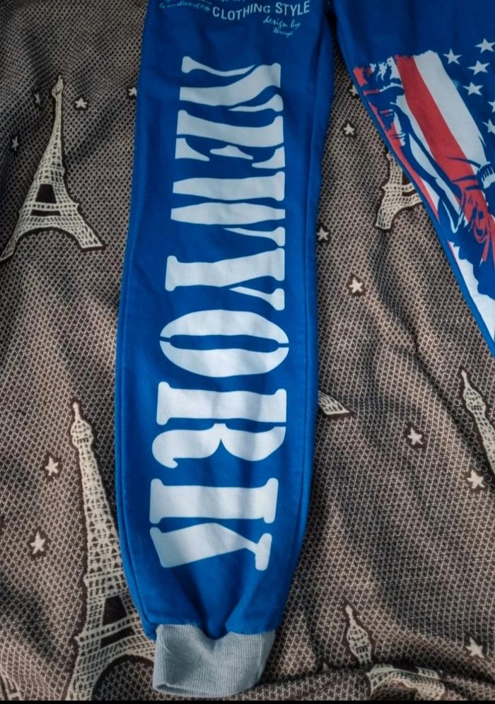 Pantalon de sport bleu imprimé New York, taille M marque ZYFG free,élastique à la taille, longueur 95cm, largeur de la taille 31cm jusqu'à 35cm, largeur cuisse 26cm, largeur cheville 13cm, léger défaut voir photos.