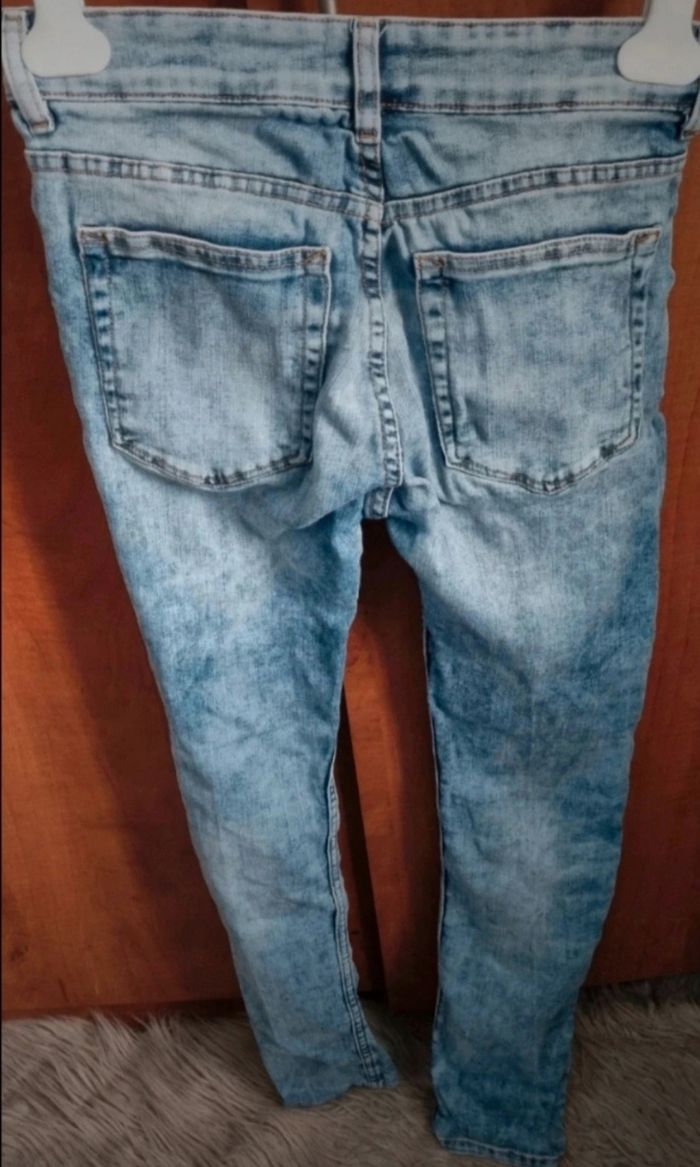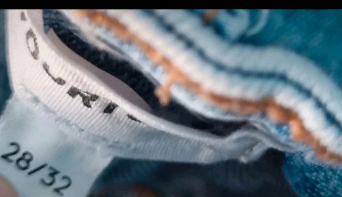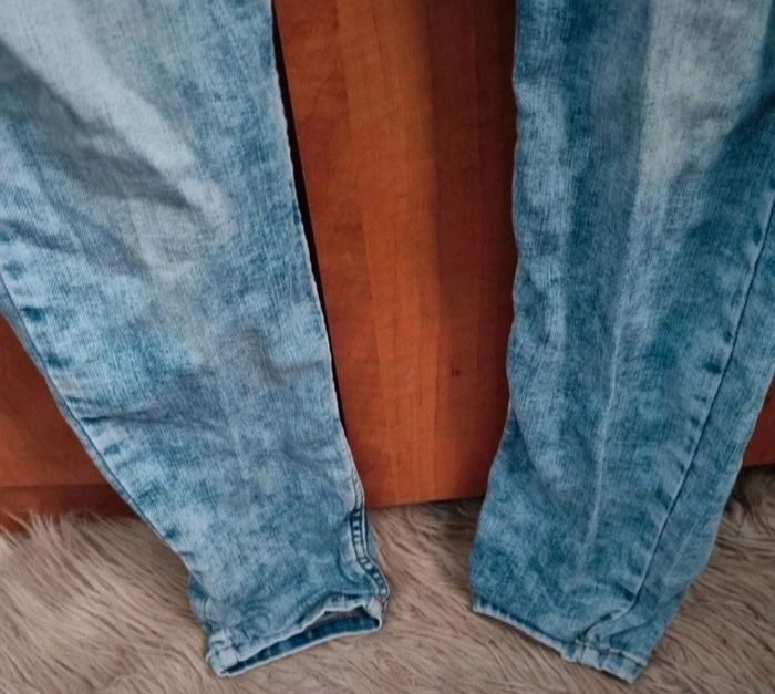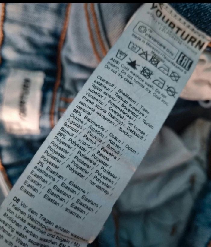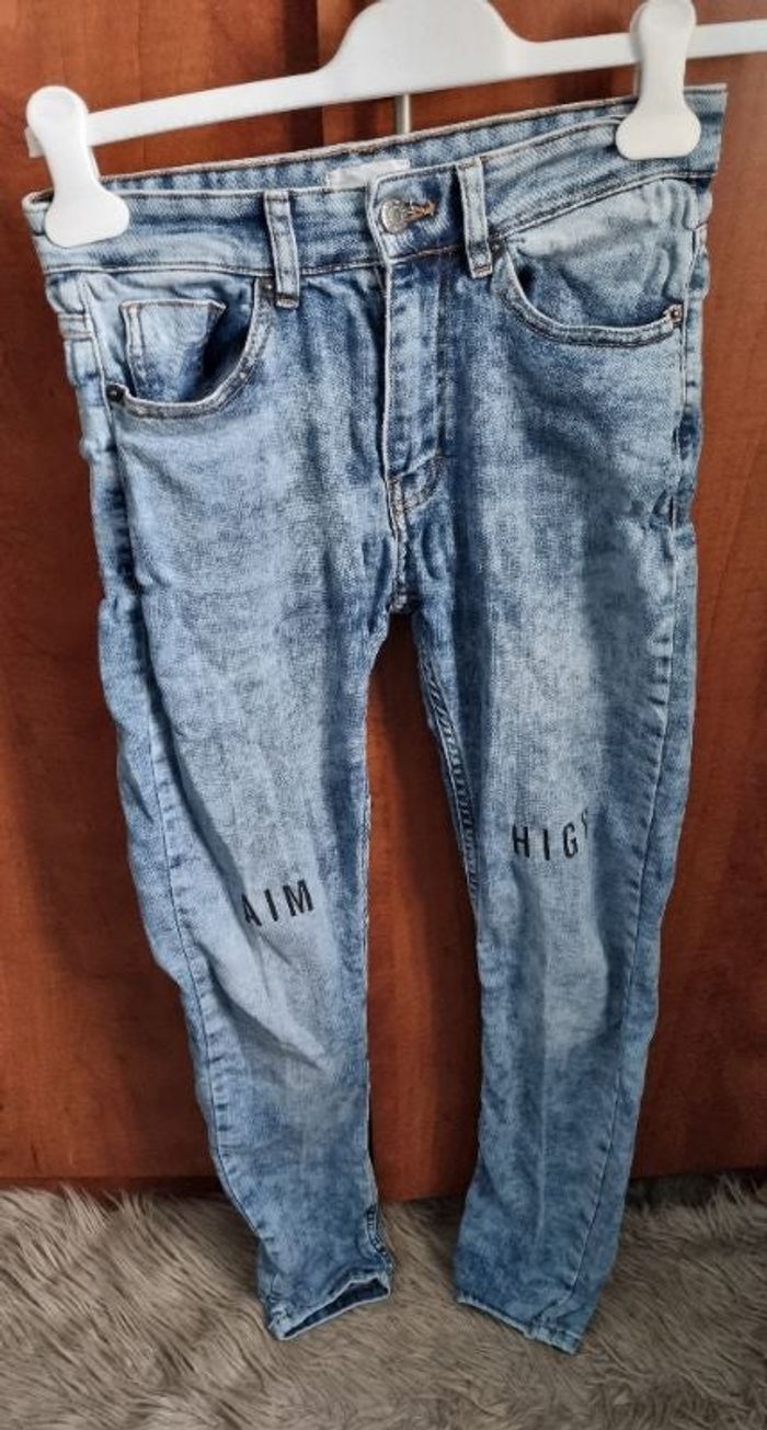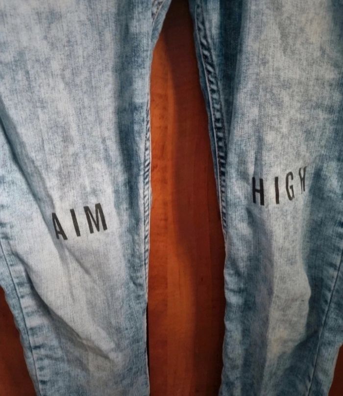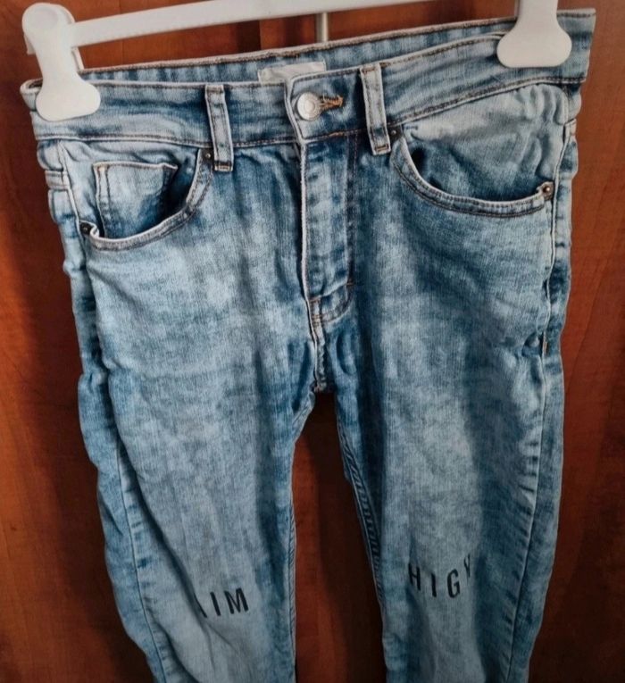 Jean avec écriture,élastique à la taille, taille 28 marque Yourturn,longueur 95cm, largeur de la taille 32cm jusqu'à 36cm,largeur cuisse 22cm, largeur cheville 13cm,léger défaut voir dernière photo.