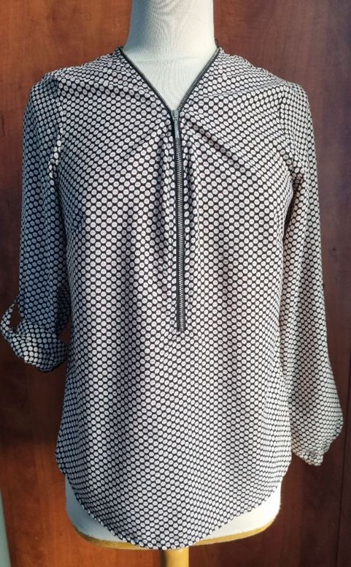 Blouse à motifs manches retroussable, taille 36 marque Cache-cache,longueur 64cm ,largeur 48cm, longueur épaule à aisselle 17cm, largeur aisselle à aisselle 47cm, longueur manche 54cm, longueur manche retroussé 31cm.