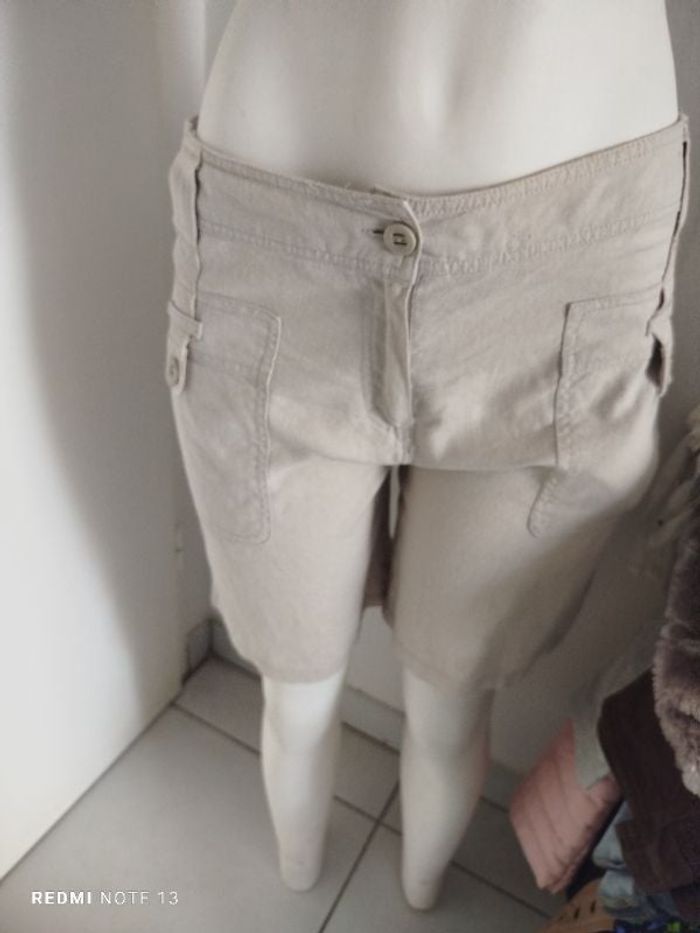 #kytie38femme. Bermuda en lin taille 38 beige zippé avec un bouton poche avant retroussable sur le bas par deux petits boutons avec son cordon de ceinture comme neuf jamais porté mesure de la taille 42 cm tour de cuisse 65 cm hauteur 50 cm réf B67