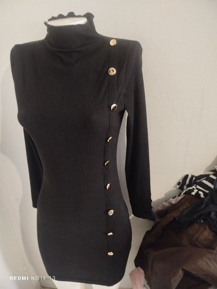 #kytieSfemme. Robe manches longues taille S côtelé col montant bouton sur le bas des manches et sur la robe en excellente état noir mesure des épaules 36 cm des aisselles 40 cm hauteur 85 cm réf V67