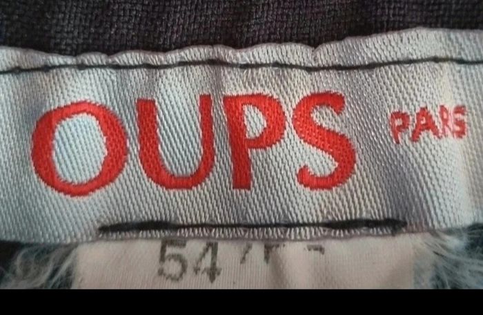 Pantalon noir taille 54/56,marque Oups Paris, zip et un bouton sur un coté, 100%polyester, longueur 104cm, largeur de la taille 51cm, largeur cuisse 36cm,largeur cheville 21cm.