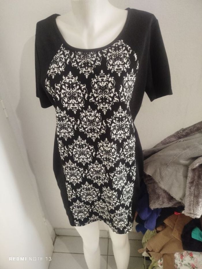 #kytieXLfemme. 👗 Robe manches courtes taille XL/XXL de marque FD.joseph col rond noir et blanche fleurie en état excellente comme neuve tissu gaufré mesure des épaules 44 cm des aisselles 52 cm hauteur 90 cm ref PH