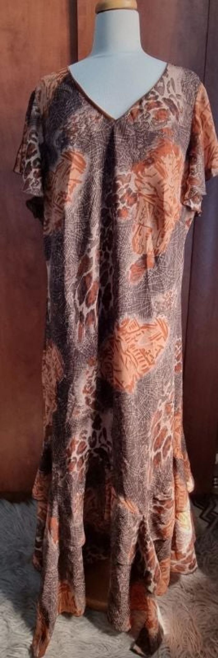 Robe longue à motifs taille 60,marque Blancheporte,avec jupon intégré, manches éffet fendue, col en V, belle et agréable porté une fois trop grande pour moi 😔,longueur 141cm,largeur 82cm.