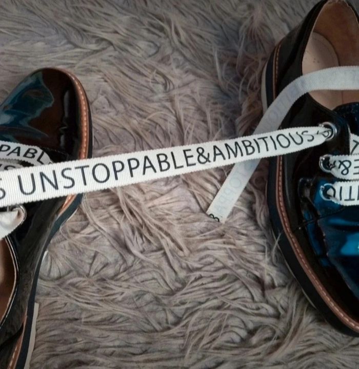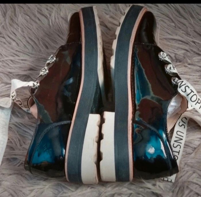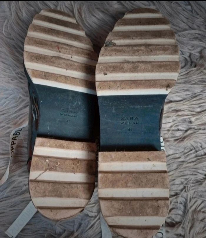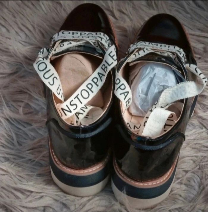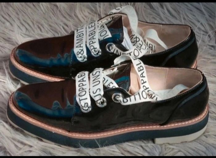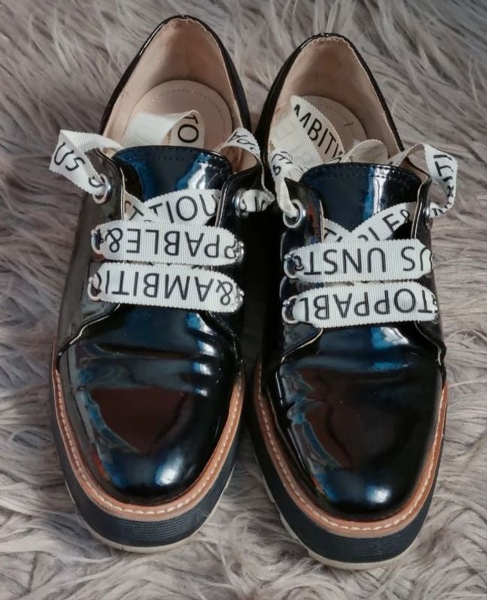 Derbie vernis noir compensée, lacet couleur crème avec écriture, marque Zara Women, pointure 41.