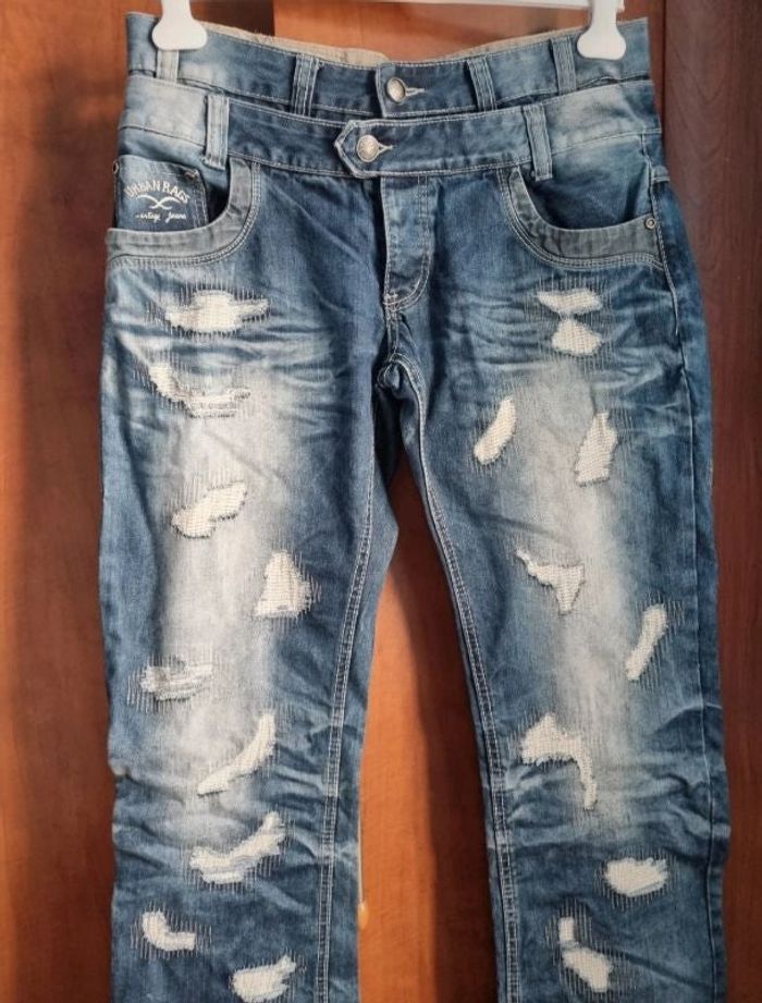 Jeans effet délavé à faux trous,taille L-XL, marque Urban Rags, style baggy, fermeture boutons,longueur 109cm, largeur de la taille 45cm, largeur cuisse 29cm, largeur cheville 23cm,très peut porté 2 léger défaut voir dernière photo.