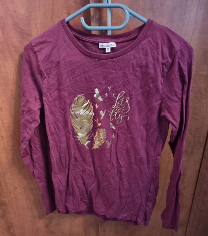 Pull fille léger couleur bordeaux taille 14ans avec dessin doré
