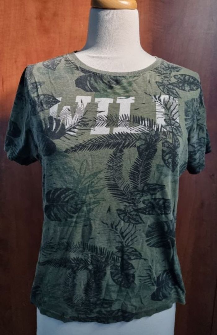 T-shirt imprimé avec écriture,taille XS (14ans),marque Kiabi, longueur 57cm, largeur 46cm, longueur épaule à aisselle 19cm,légèrement délavé et usé sous les aisselles voir photos.