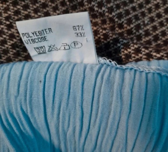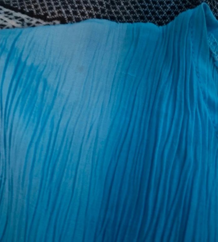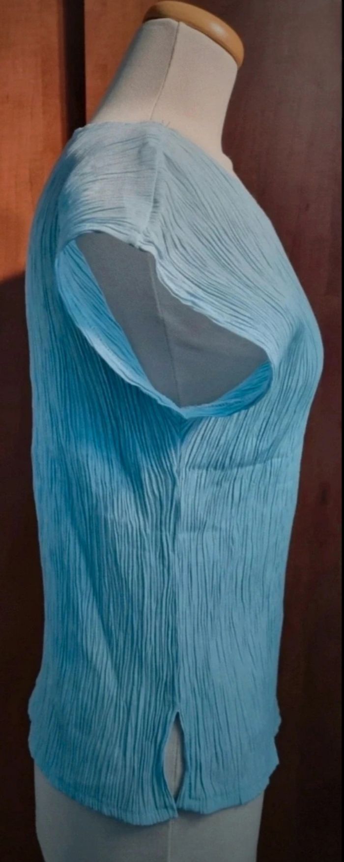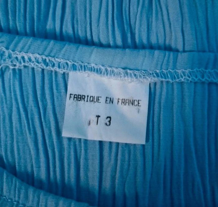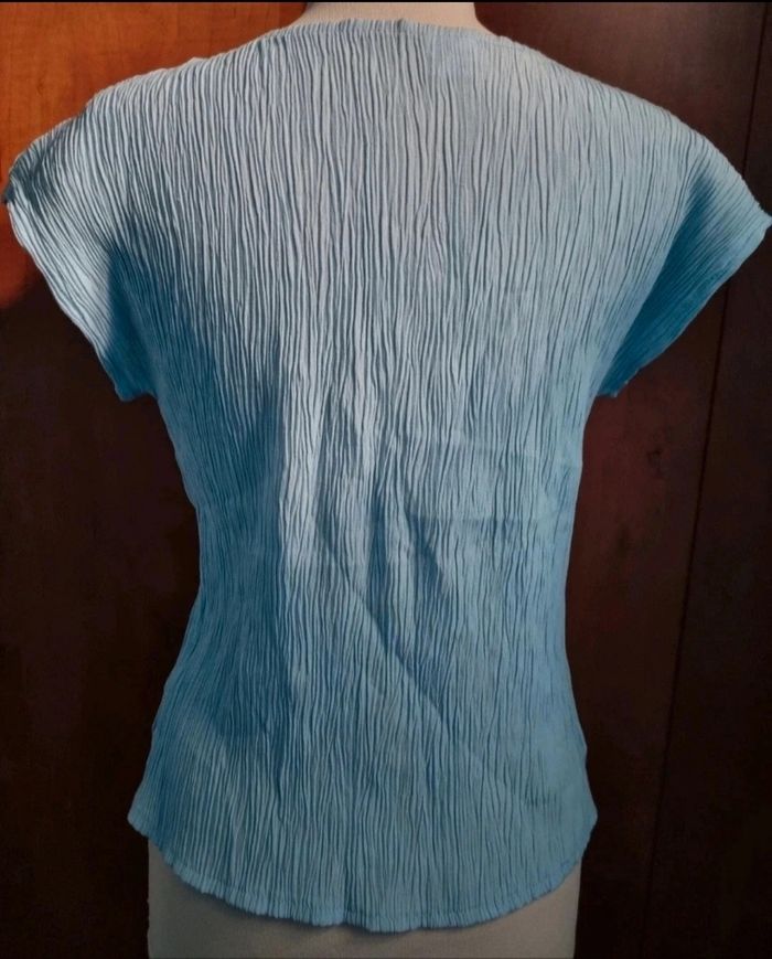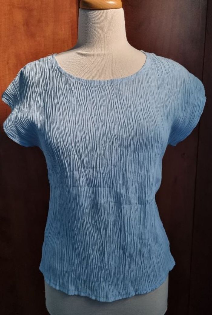 T-shirt effet crépon taille 3,longueur 59cm, largeur 41cm, longueur épaule à aisselle 19cm, largeur aisselle à aisselle 49cm,mini tache voir photo.