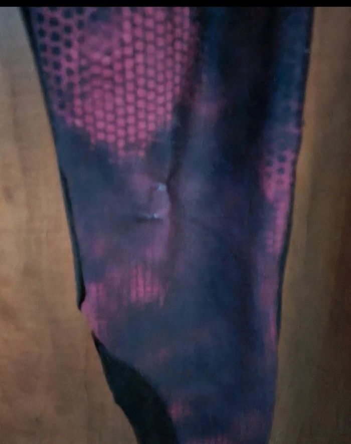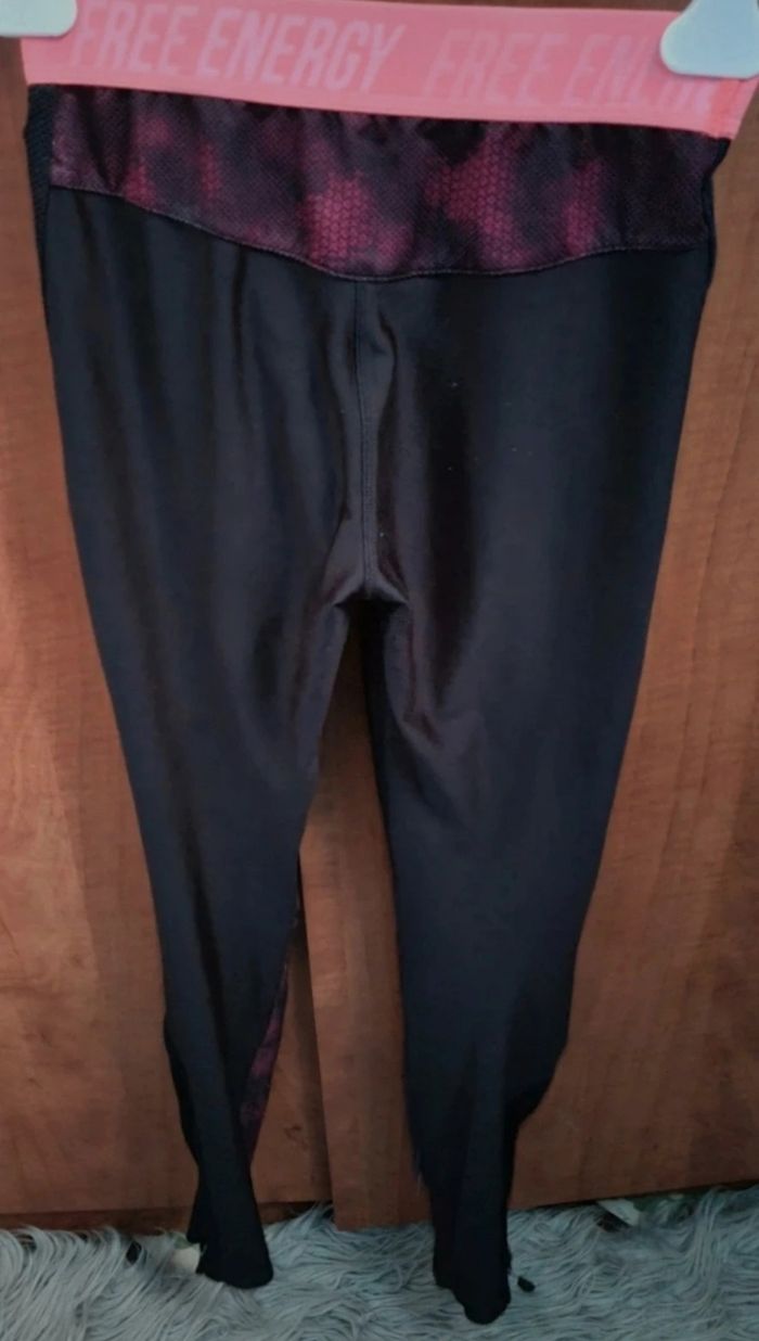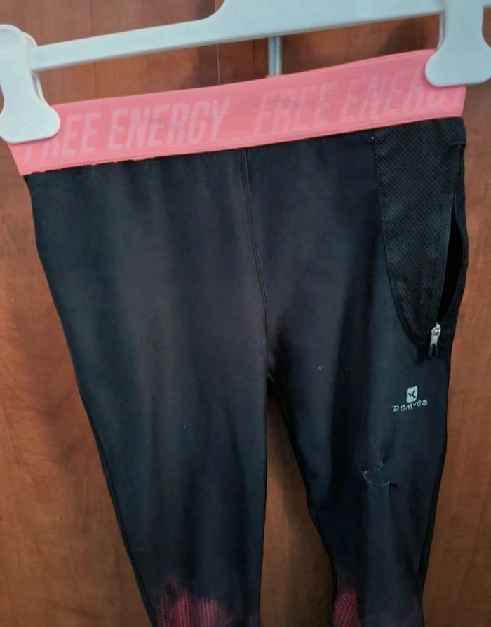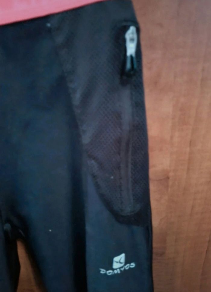 Legging de sport taille XS marque Domyos, noir et rose fluo, une poche,longueur 83cm, largeur de la taille 30cm jusqu'à 34cm, largeur cuisse 21cm, largeur cheville 9cm jusqu'à 11cm,recousue voir photos.