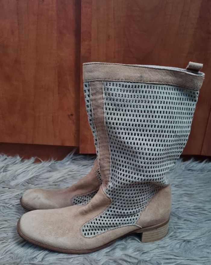 Bottes demi-saisons couleur camel, pointure 40 marque Ikks, en cuir, daim ajouré,se porte tombante sur la jambe, hauteur talons 5cm, hauteur complète 32cm, hauteur sans talons 29cm.