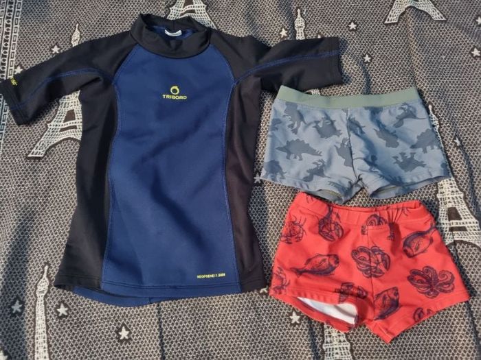 -haut de plage marque Tribord UPF 50+,taille 2-3ans, longueur 44cm, largeur 29cm, longueur épaule à aisselle 10cm,largeur aisselle à aisselle 31cm, longueur manche 15cm, largeur épaule à épaule 26cm, -short de bain rouge motifs poissons, crustacés et pieuvre, taille 2-3ans,longueur 15cm,largeur de la taille 20cm jusqu'à 23cm, largeur cuisse 13cm,(bonne état), -short de bain gris motifs dinosaures, taille 4-6ans marque Zeeman,longueur 16cm, largeur de la taille 23cm jusqu'à 26cm, largeur cuisse 14cm.