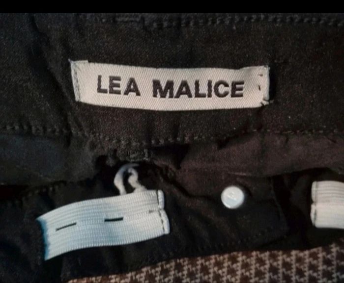 Pantalon noir avec zip et ondulé, taille 32 marque Léa Malice,longueur 83cm, largeur de la taille 30cm jusqu'à 32cm, largeur cuisse 22cm, largeur cheville 11cm.