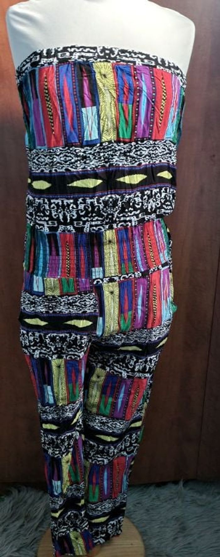 Combinaison à motifs sans manches ni bretelles,taille S-M marque CC Collection, élastique à la taille, 2 poches, longueur 126cm, largeur poitrine 44cm-46cm,largeur de la taille 32cm jusqu'à 44cm,largeur cuisse 28cm jusqu'à 30cm, largeur cheville 14cm,légère.